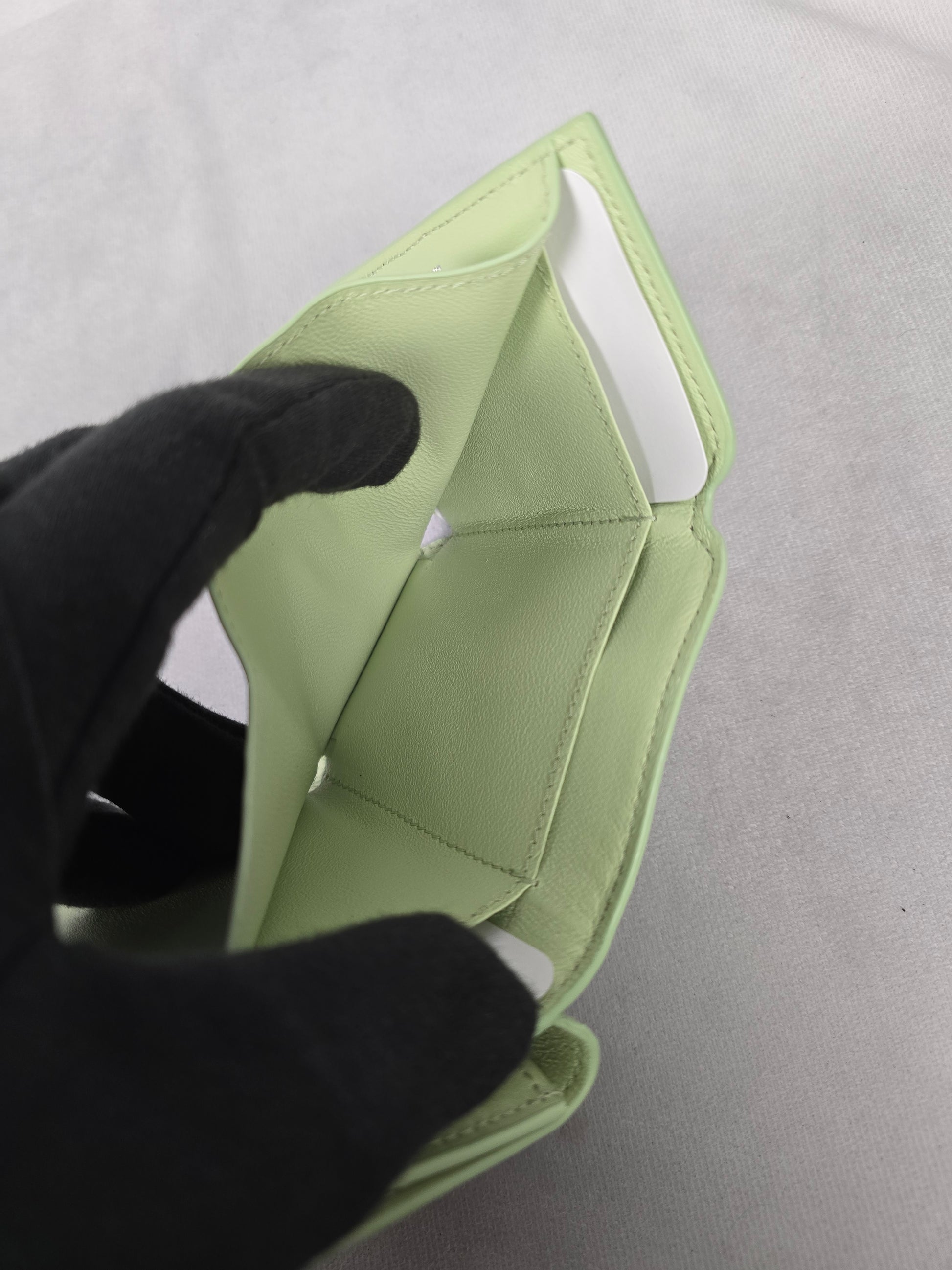 Balencia Cash Mini Wallet in green calfskin with a lilly print in green/yellow. Features 1 snapped coin purse, 1 snapped bill pock, and 3 card slots. Perfect to use with your smaller bags. This one is in excellent new condition. $475 retail price.