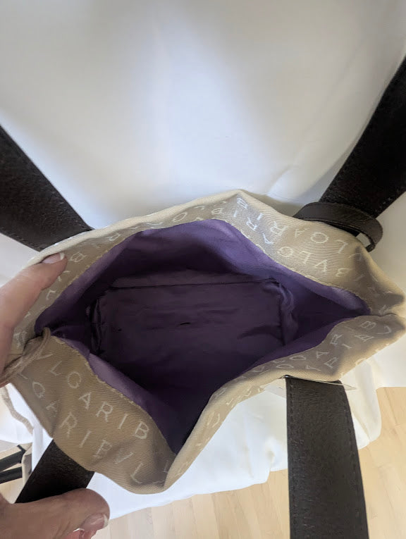 Elegant Bvlgari beige tote featuring a spacious interior and two convenient pouches for organized storage. Crafted with high-quality materials and finished with a striking purple interior.