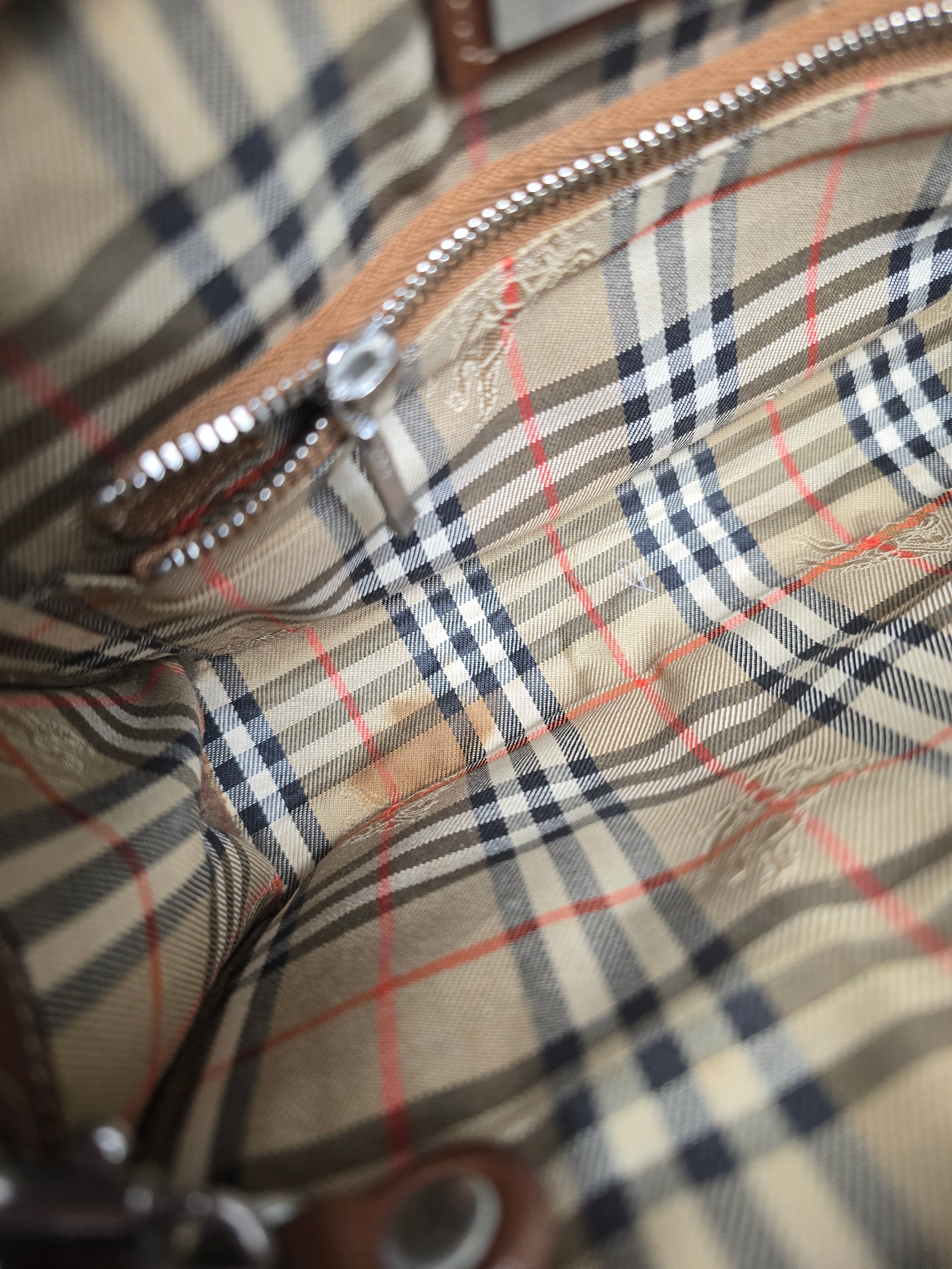 Cute vintage brown leather Burberry wristlet with the iconic house check plaid interior. Wristlet strap is removable. Has one side pocket and an additional zippered pocket on the interior. Goodd vintage condition on the exterior with a few rubs. Small stain on the interior. Please see all photos.
