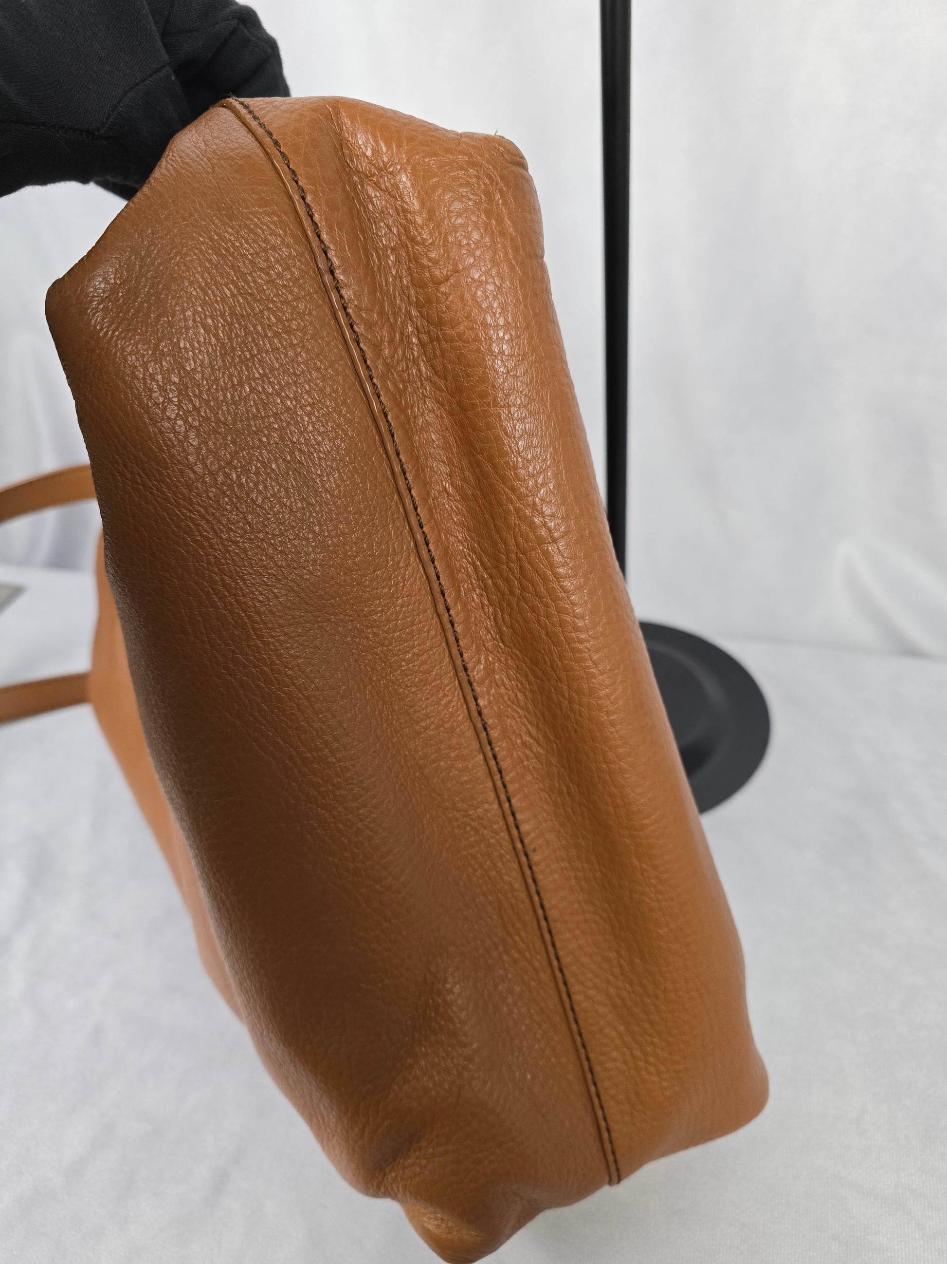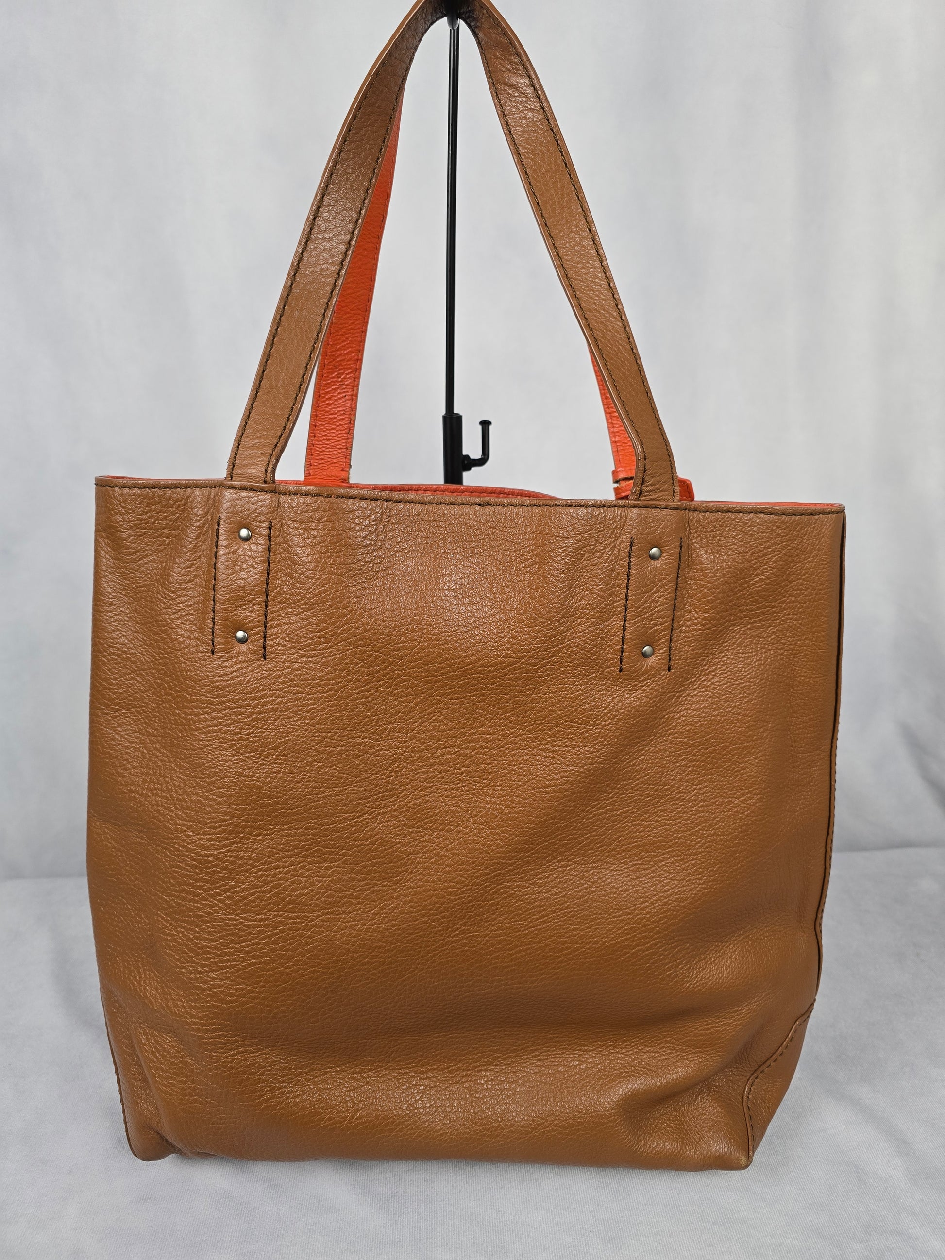 This Burberry tote is in a rich brown leather with striking orange accents and matching luggage tag. Reversible to the orange shade - leather inside and out. In very good preowned condition.