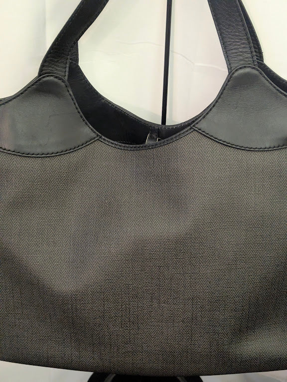 Elegant and versatile Bvlgari tote crafted in gray coated canvas with black leather trim and sturdy handles. Features a silver-tone hardware clasp closure, two spacious zipper compartments, two additional interior pouches, and a convenient key hook for organization. Snap side closures allow for adjustable capacity. Exterior and interior are in Very Good+ condition.