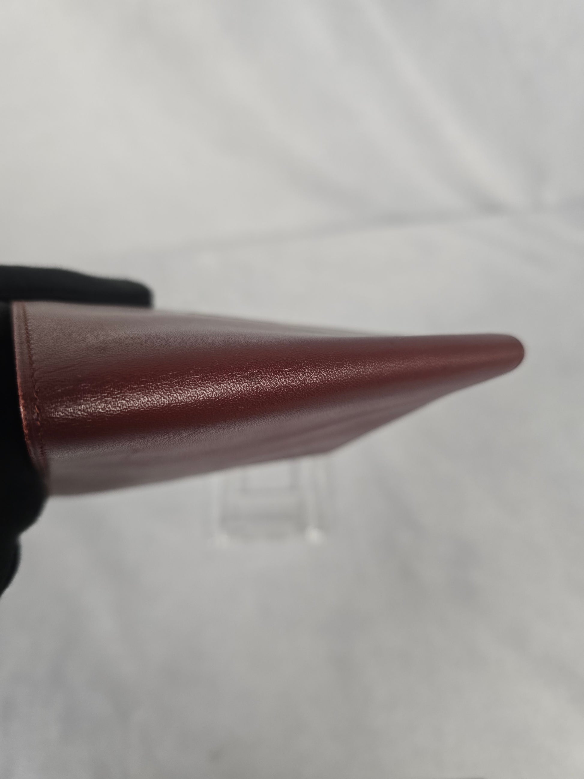 Vintage Cartier Must de Bi-Fold Wallet in bordeaux leather with gold-tone metal corners and embossed Cartier logo on the front. This wallet is in very good condition - a timeless classic with original authenticity card.