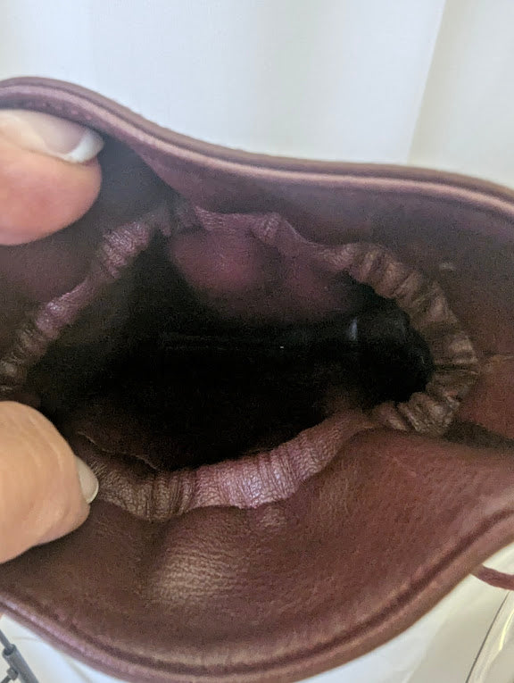 Elevate your accessories with this classic Cartier Must mini coin pouch, crafted in rich Bordeaux leather with a chic drawstring closure. The exterior shows one small mark on the bottom—please see photos. Includes Real Authentication Certificate of Authenticity.