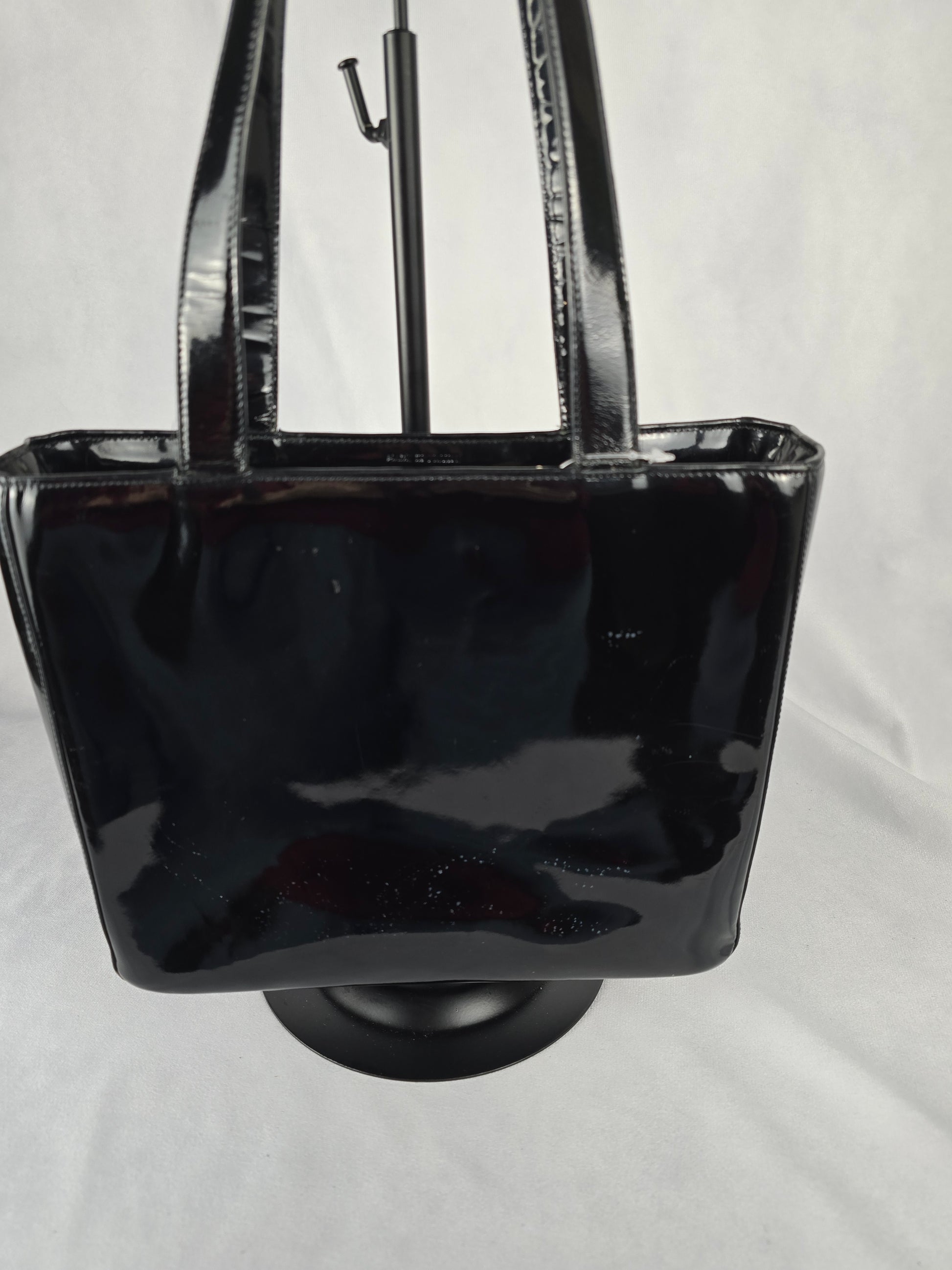 Chanel black patent LAX tote from the 2000-2002 Karl Lagerfeld collection. This vintage item is in good pre-owned condition.