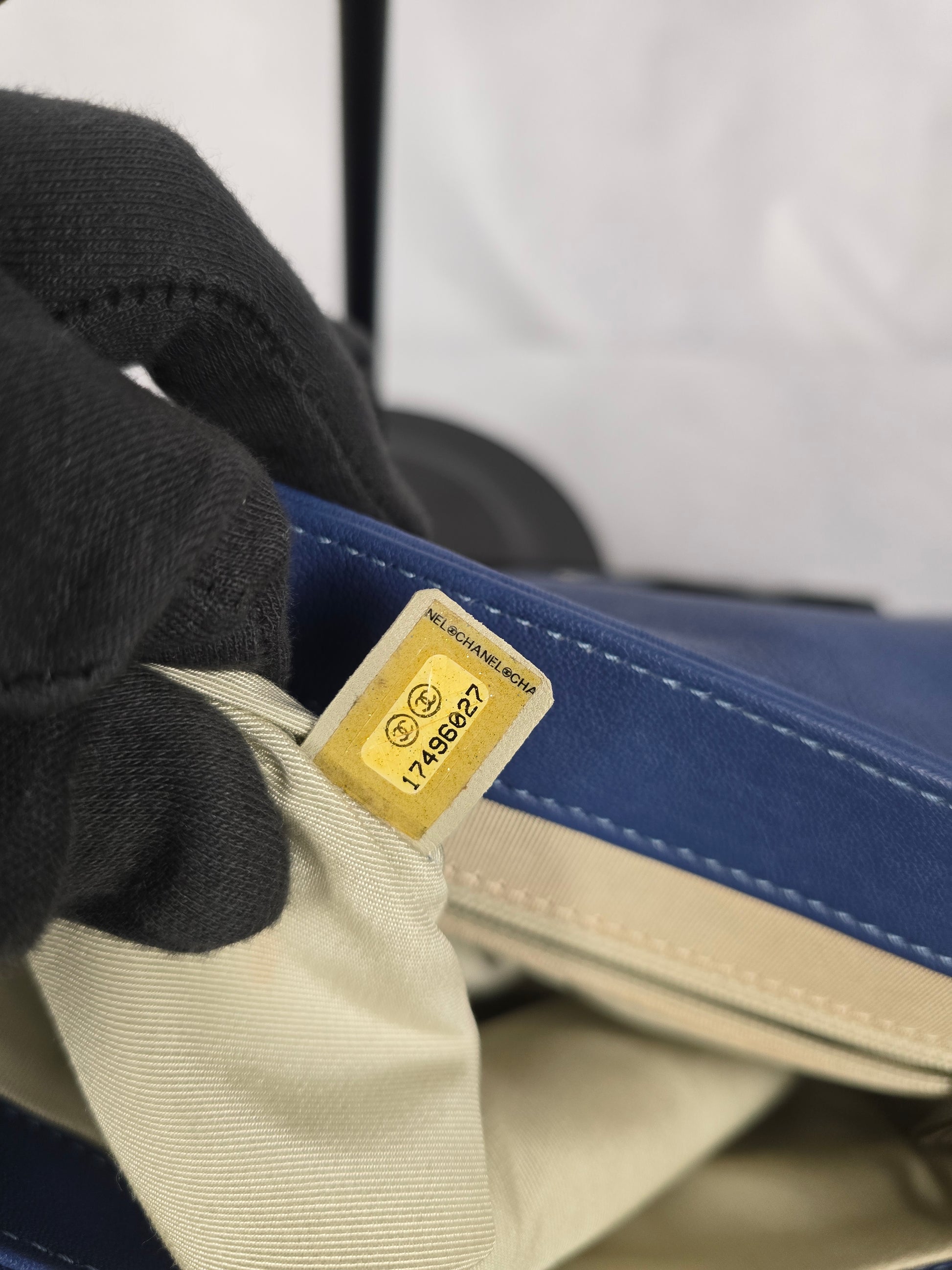 Chanel blue Chain Around Flap bag with the iconic diamond quilting and the distinctive "chain around" woven chain braided around the edges of the bag. Features silver hardware and CC turn-lock closure. In very good preowned condition with holo - no callouts noted! From the 2012 Cuite Collection by Karl Lagerfeld.