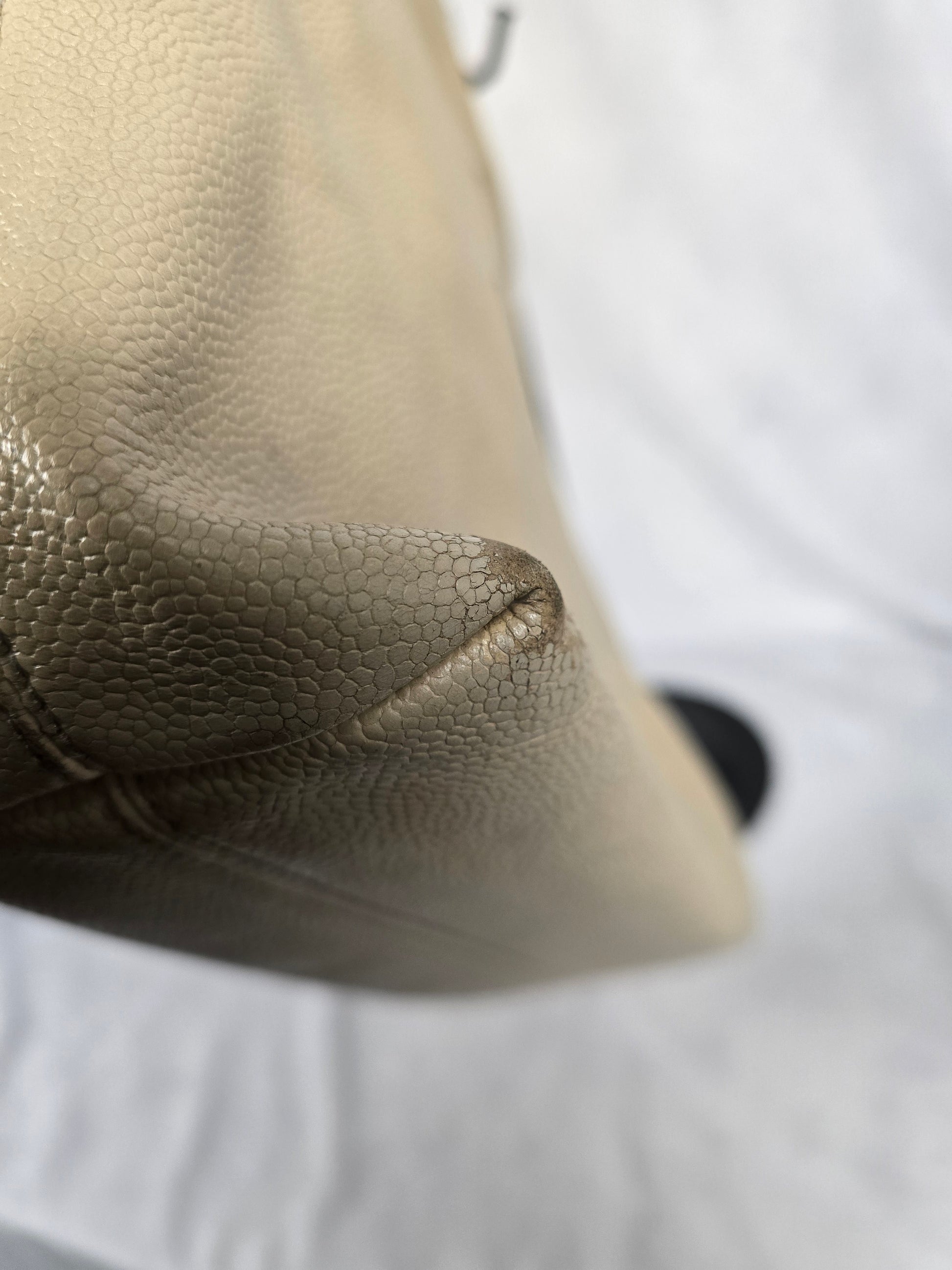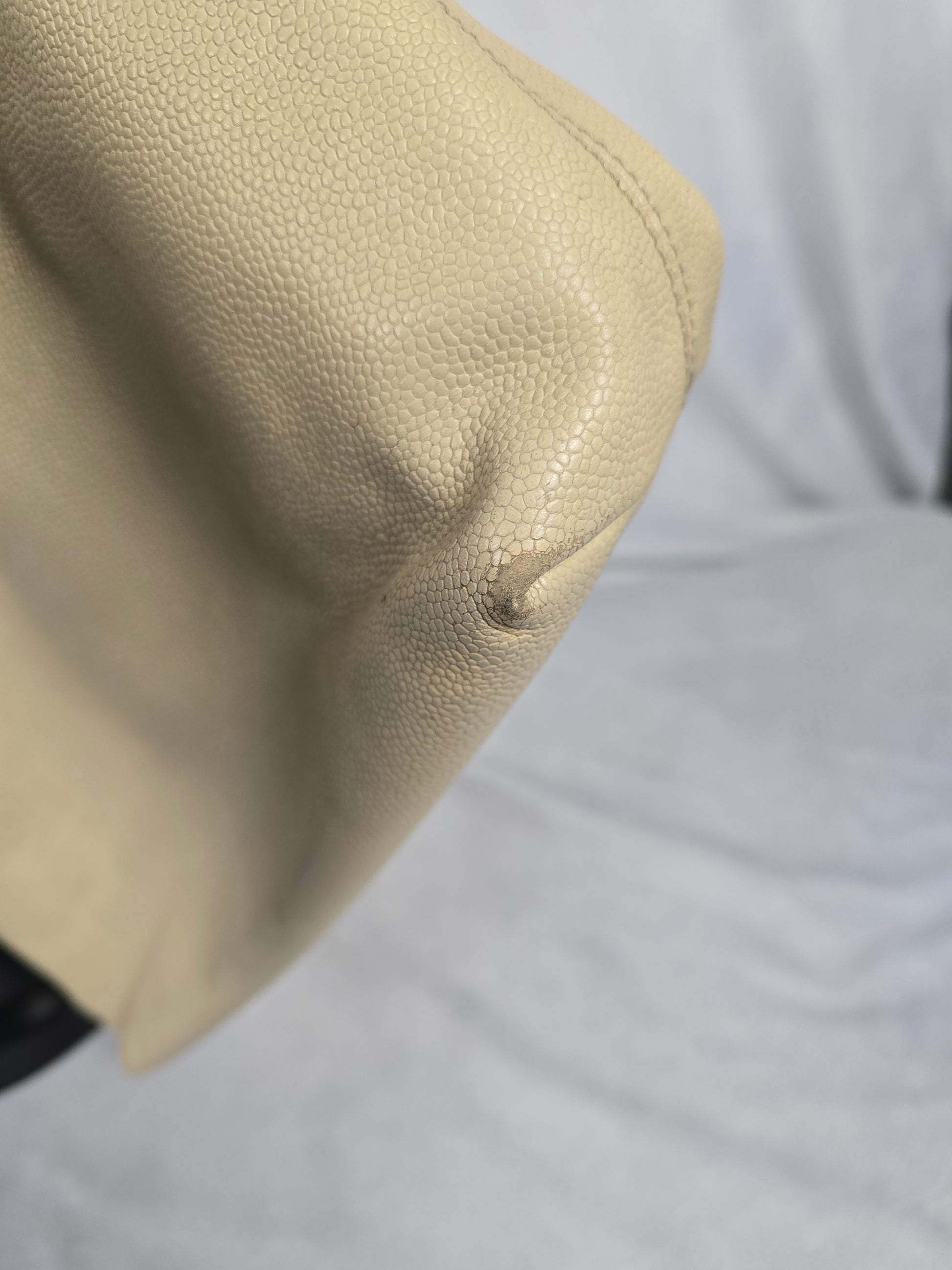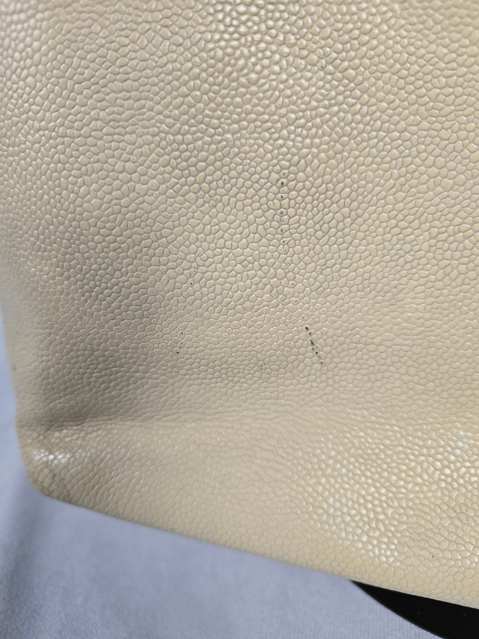 This Chanel CC Mark Beige tote in caviar leather has stories to tell - she is a 5 series with a 1997-1999 manufacture range. Shows signs of wear on the handles and corners with some staining on the interior. Stiil has plenty of life left in her - would be a great daily tote. Please see photos for signs of wear.