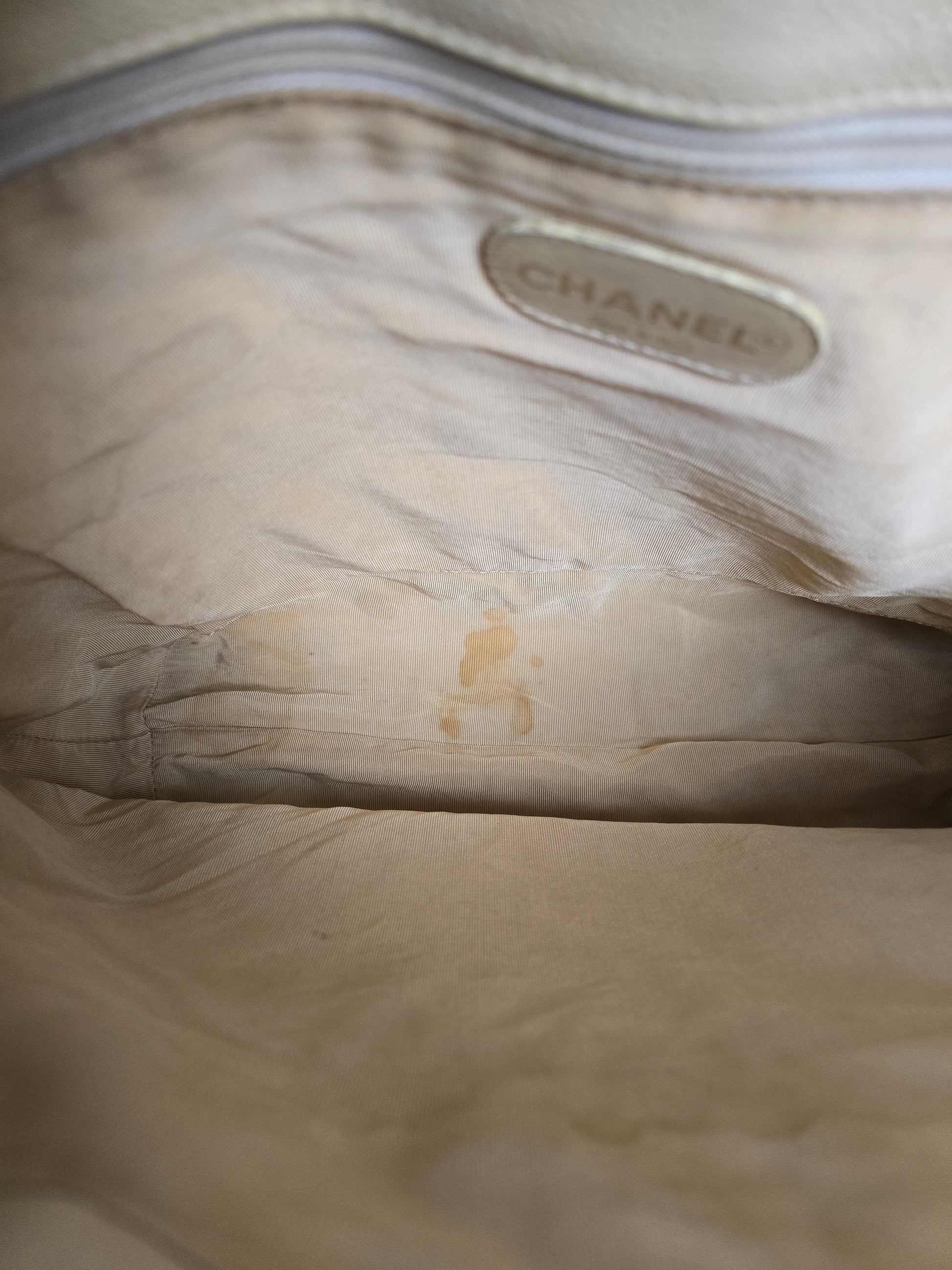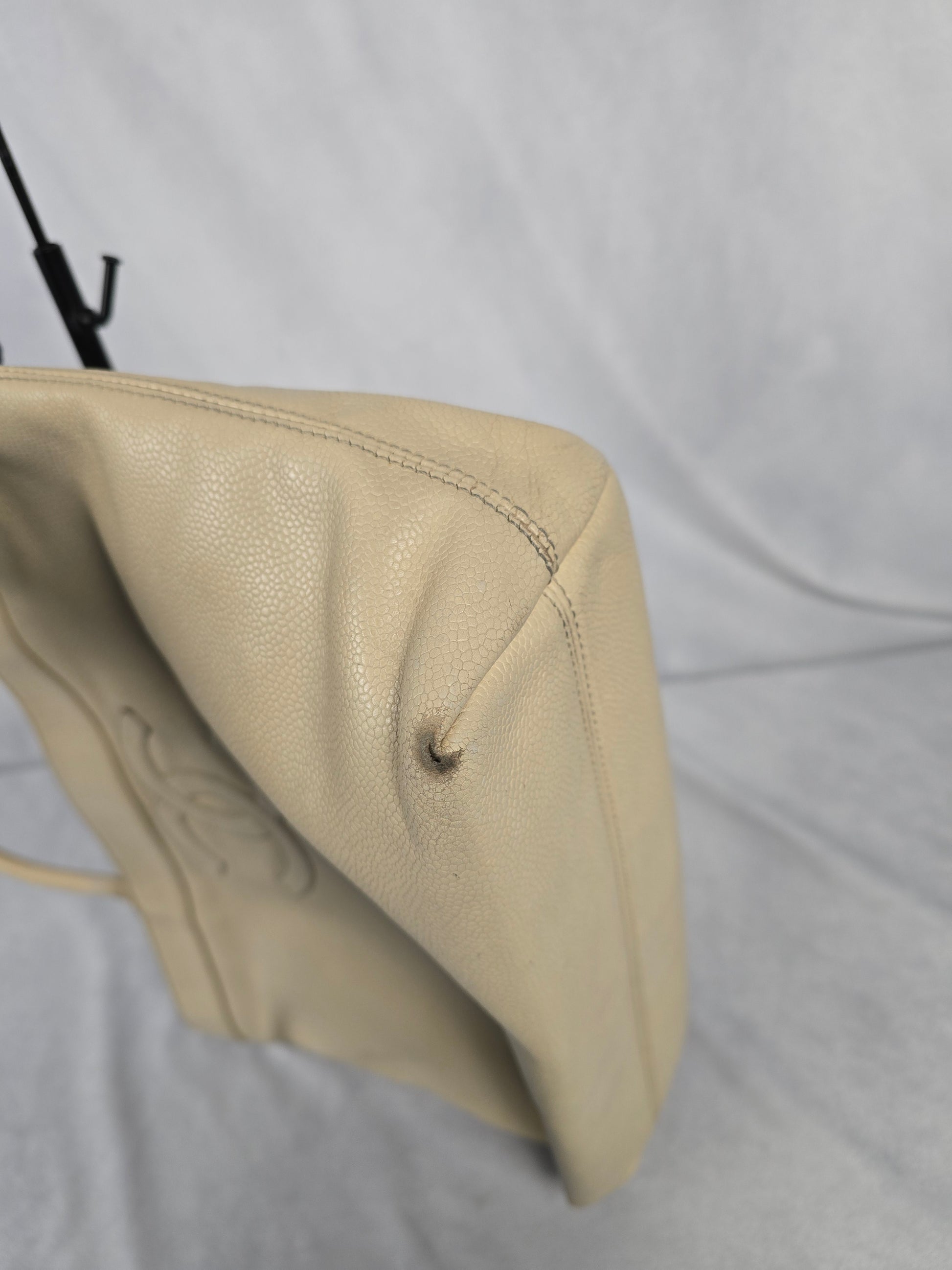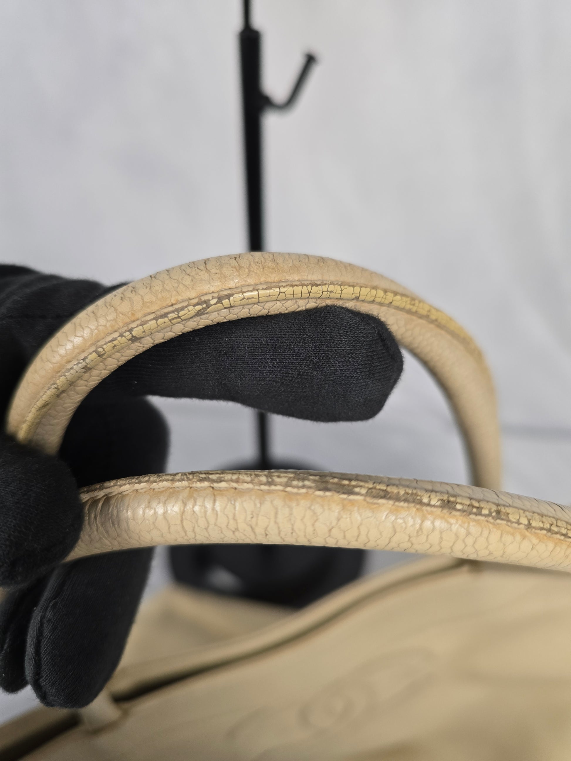 This Chanel CC Mark Beige tote in caviar leather has stories to tell - she is a 5 series with a 1997-1999 manufacture range. Shows signs of wear on the handles and corners with some staining on the interior. Stiil has plenty of life left in her - would be a great daily tote. Please see photos for signs of wear.