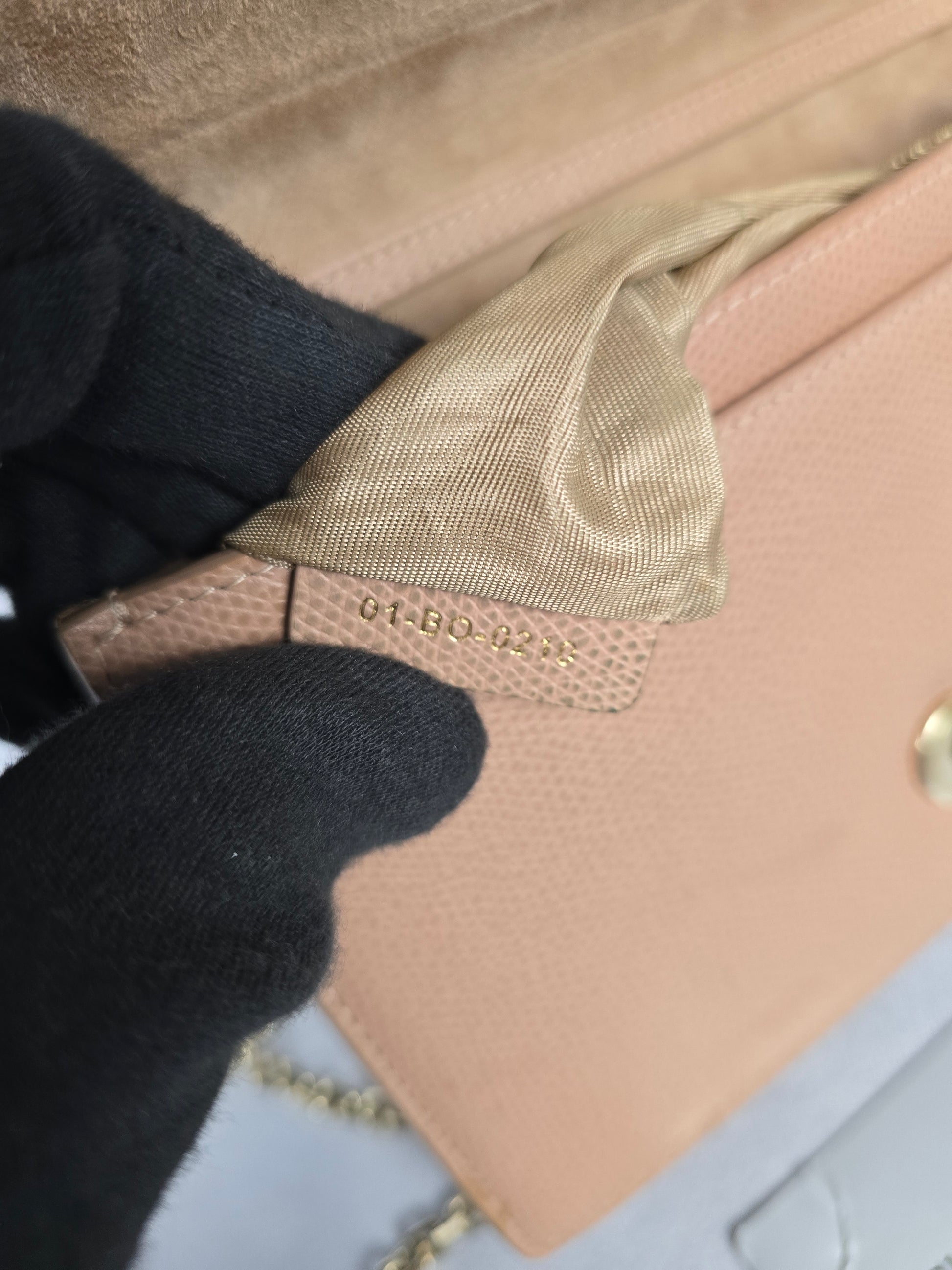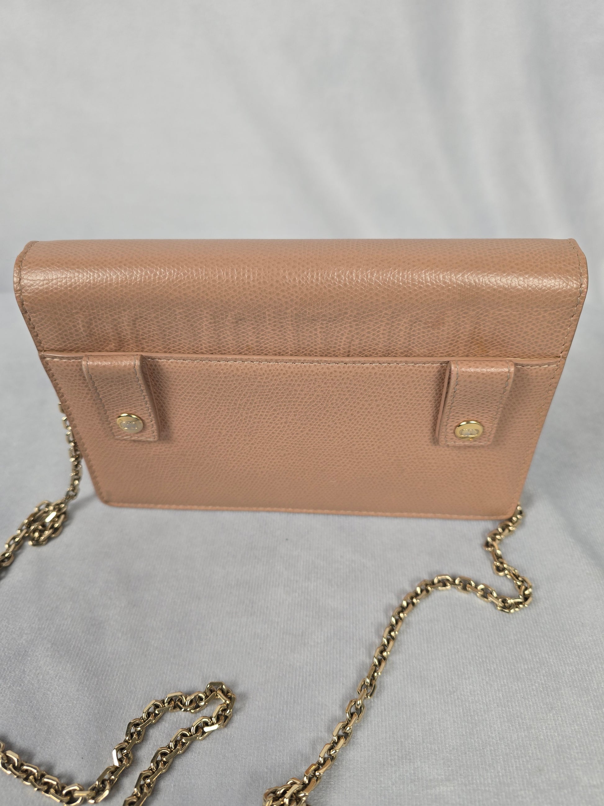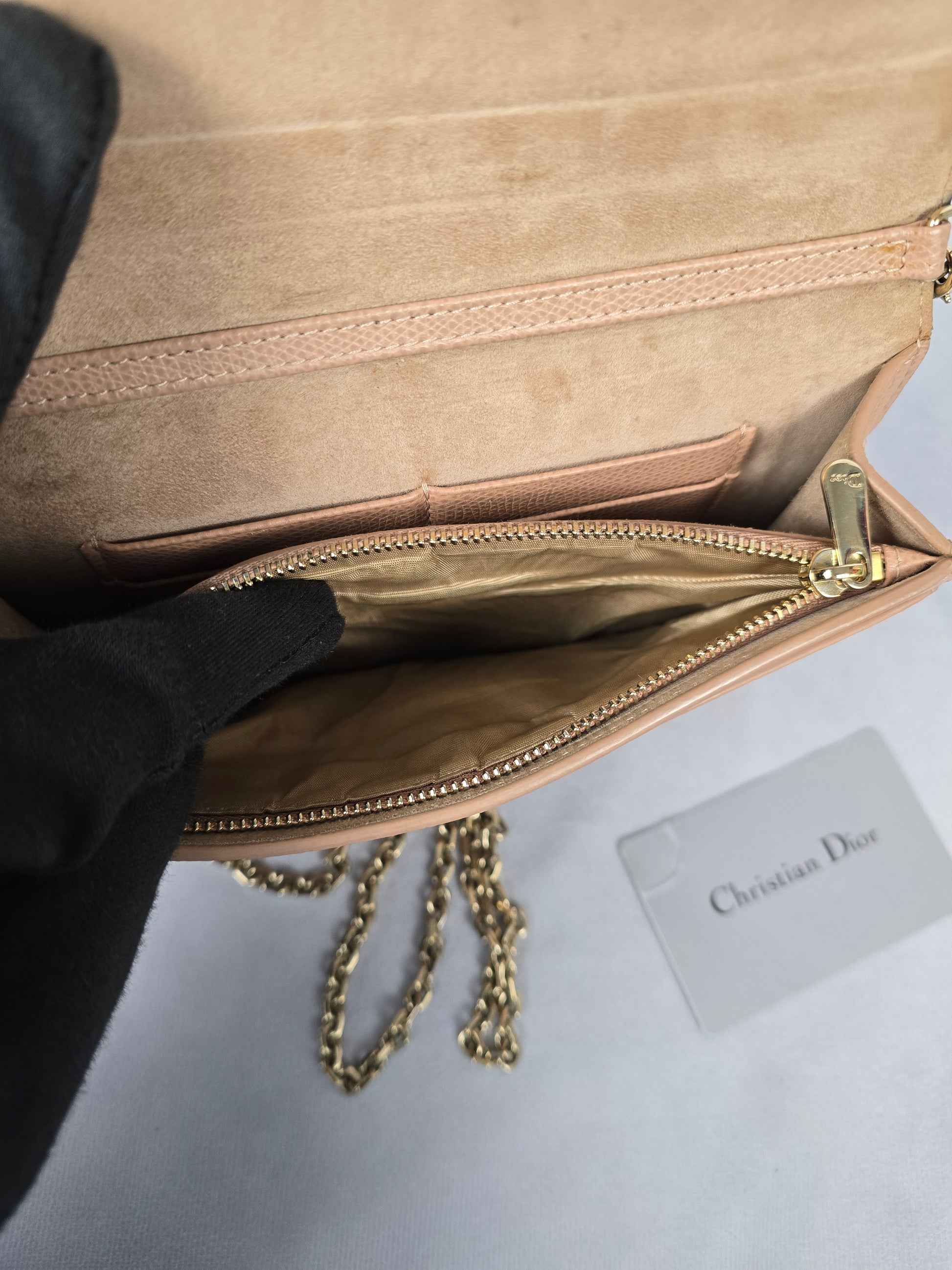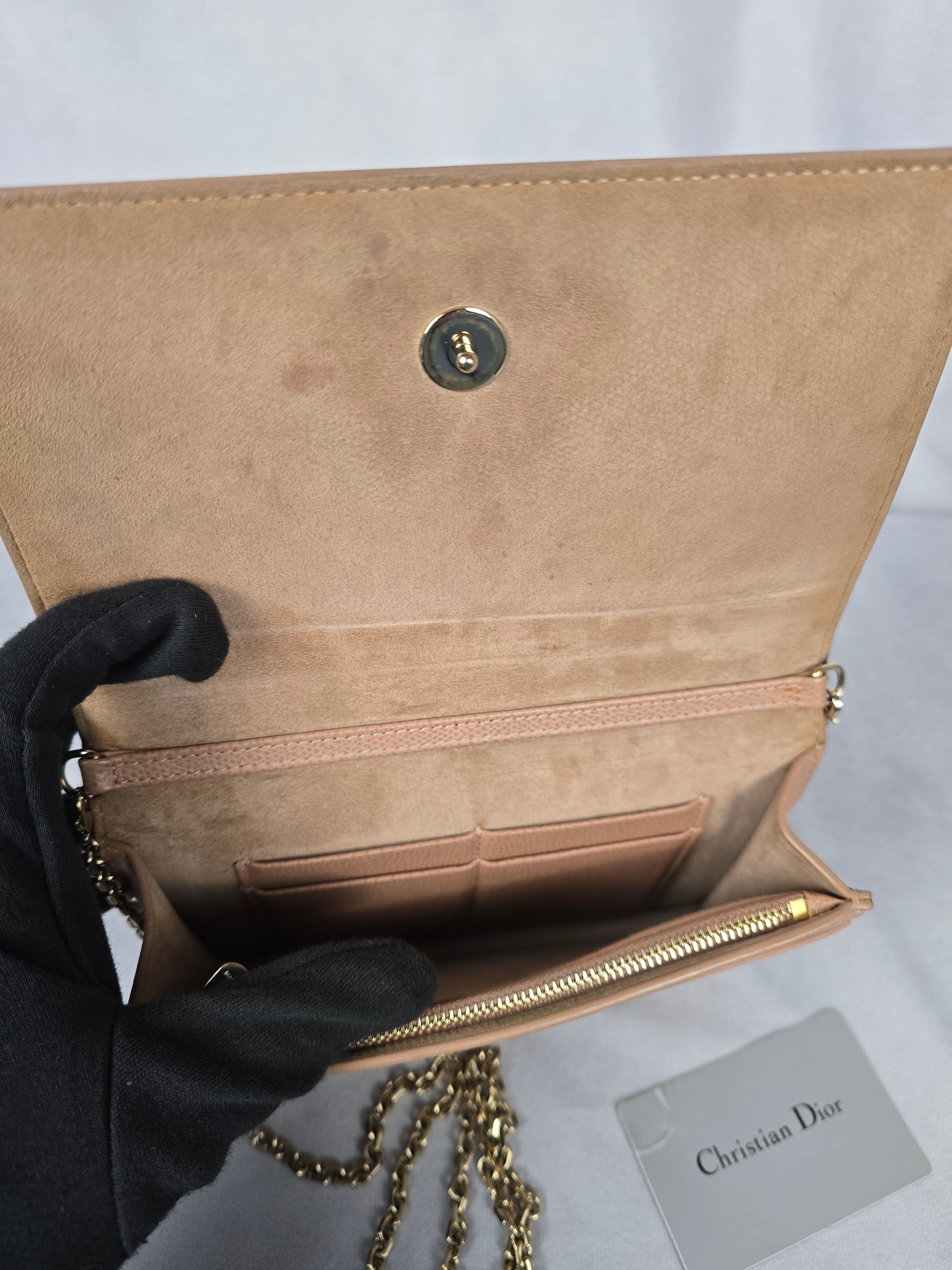 Christian Dior Montaigne chain wallet in beige made of grained calfskin leather with a gold-tone CD clasp. Comes with the original removable chain. The bag has several compartments including a zipper pocket and card slot. Has attachment on back to also use as a belt bag. In very good condition.