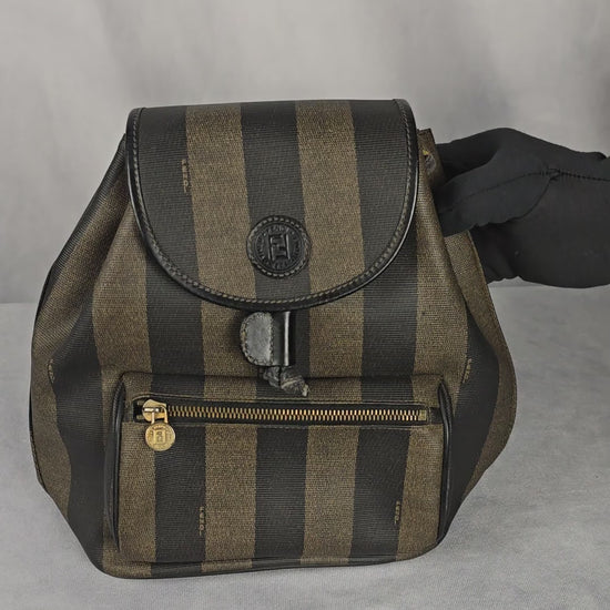 Vintage Fendi Penguin backpack in black/brown Fendi stripe. Side zippers to access the inside. Excellent pre-owned condition.