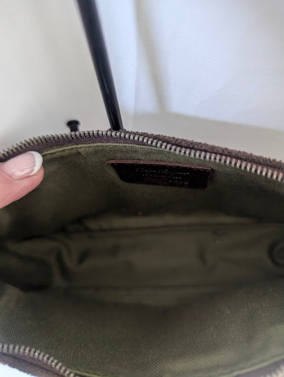 The interior features a stunning olive-green lining with a clean, well-kept finish. The exterior is in Good+ condition, showing gentle wear consistent with careful use. A comfortable 9" strap drop allows for easy shoulder wear, and the slim profile adds chic versatility.