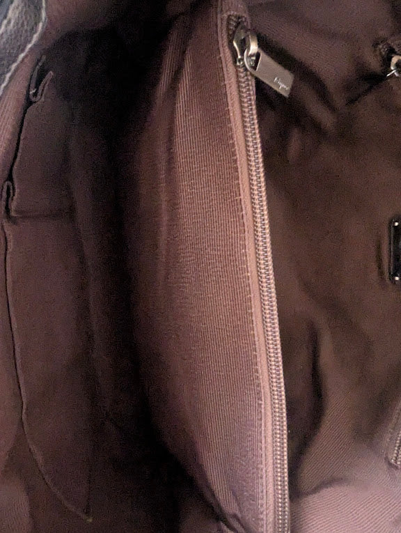 The bag features a secure magnetic snap closure and a double-compartment interior, including a central zippered section and an additional side zipper pocket—perfect for keeping essentials neatly stored. Light corner wear is present, consistent with gentle use; please refer to photos for details.