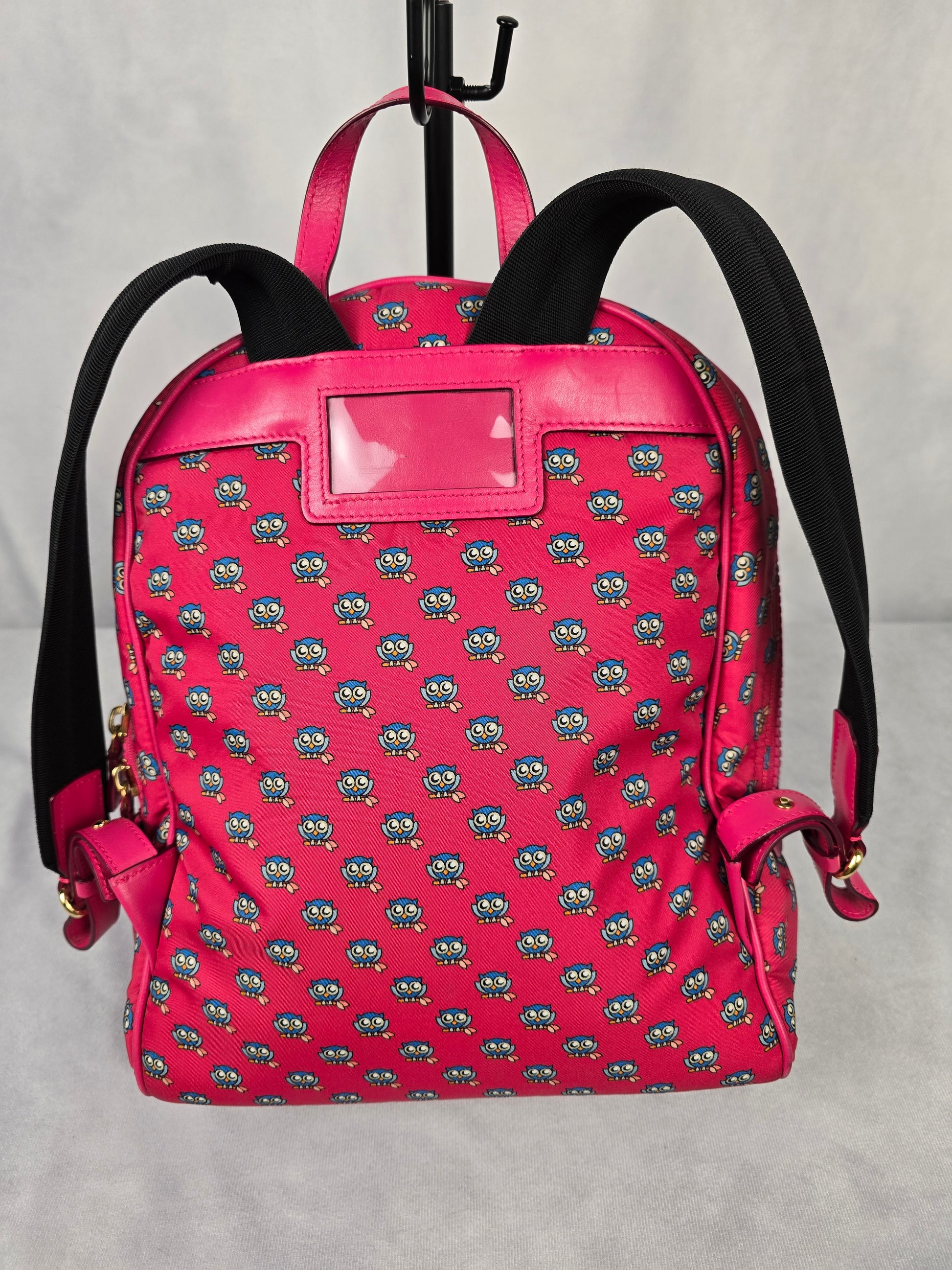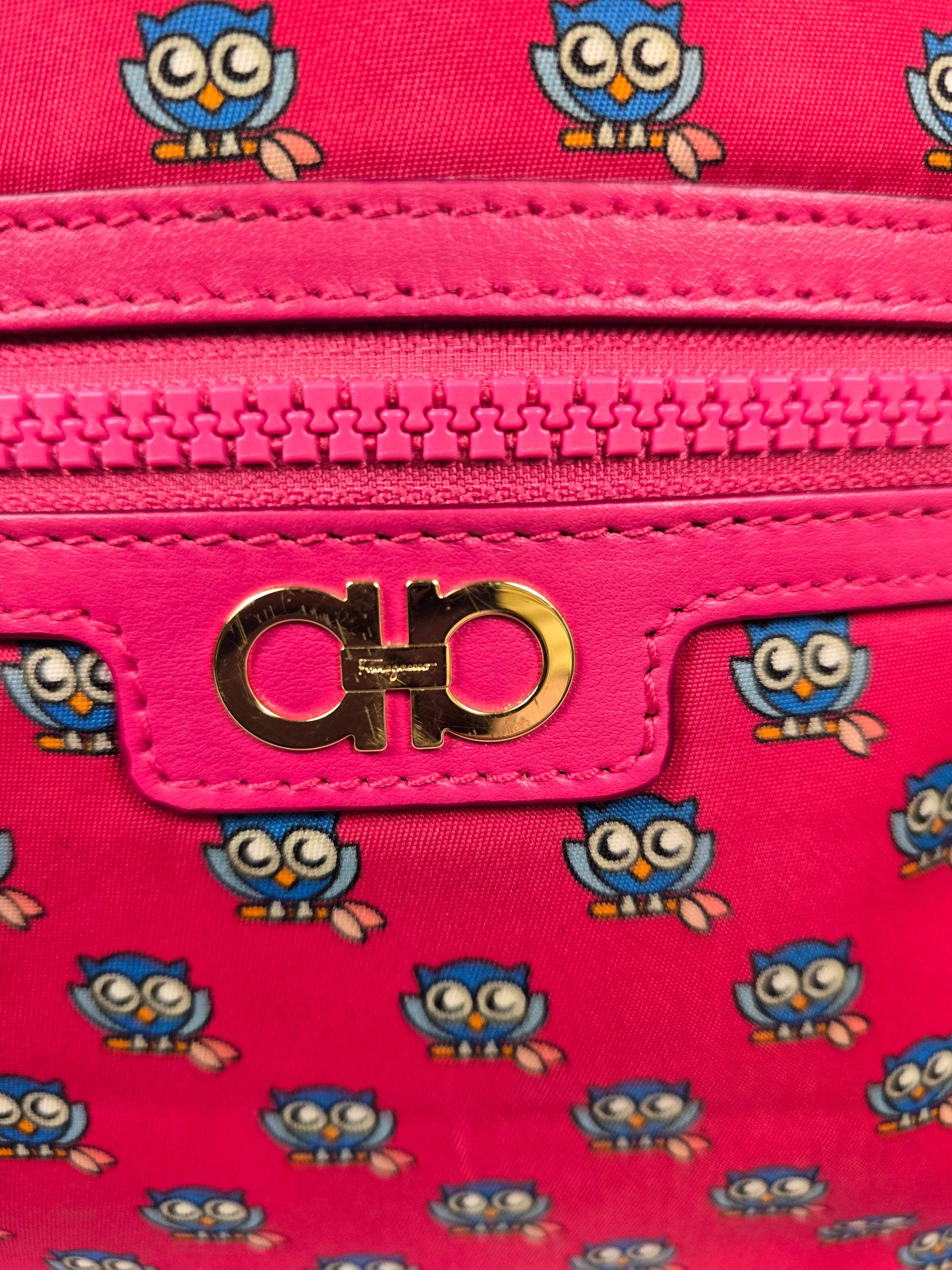 Cute Ferragamo Gancini backpack with an adorable owl print in a stunning pink. This model features the signature Gancini logo on the front pocket with a front zipper pocket and adjustable shoulder strap. The smaller size makes it perfect for kids or adults who want a smaller backpack. In excellent condition!