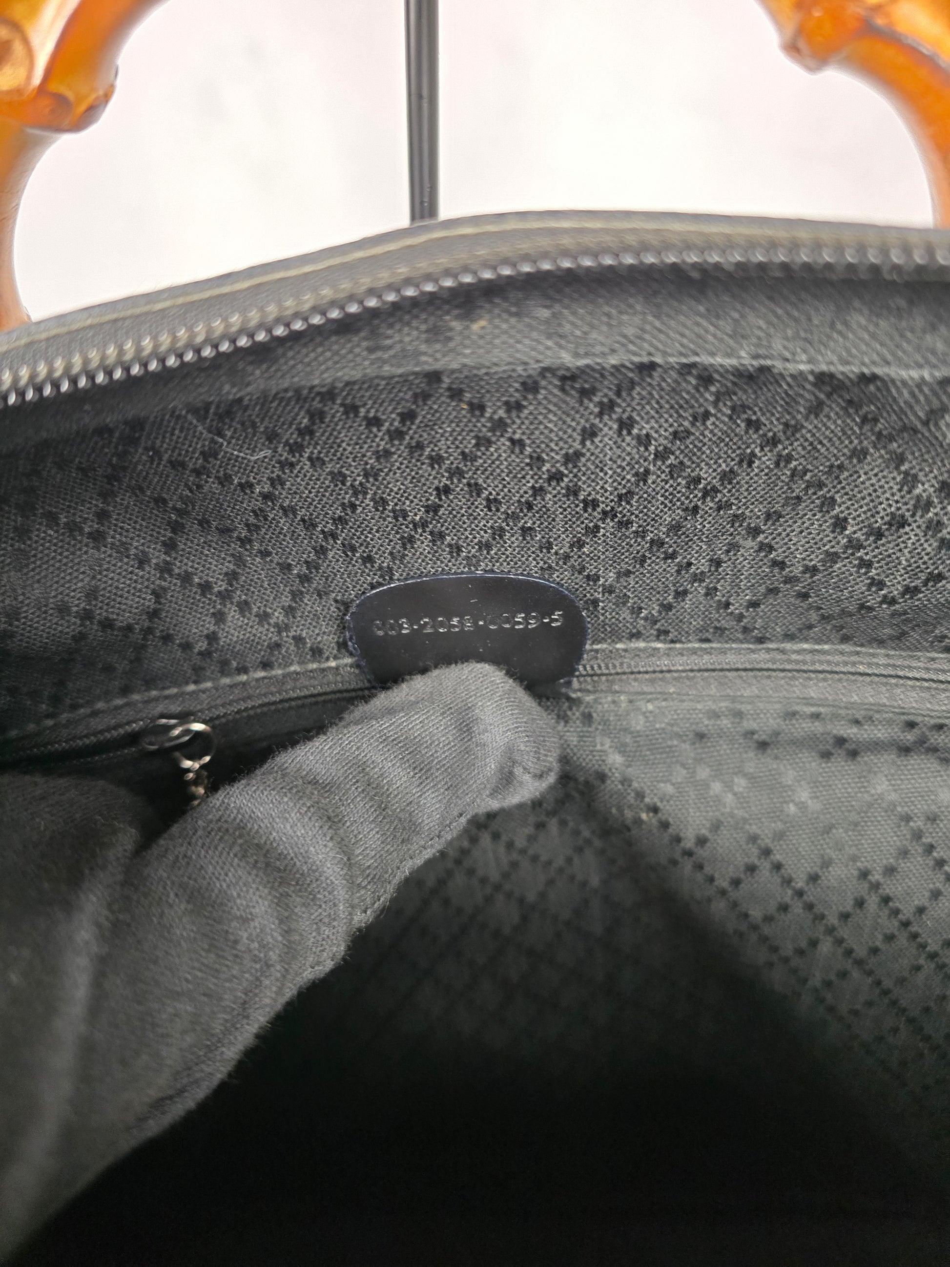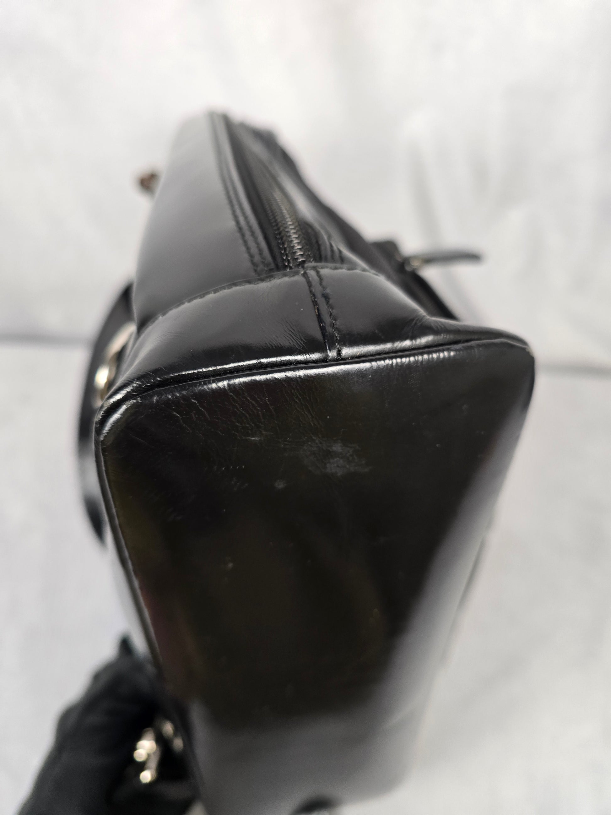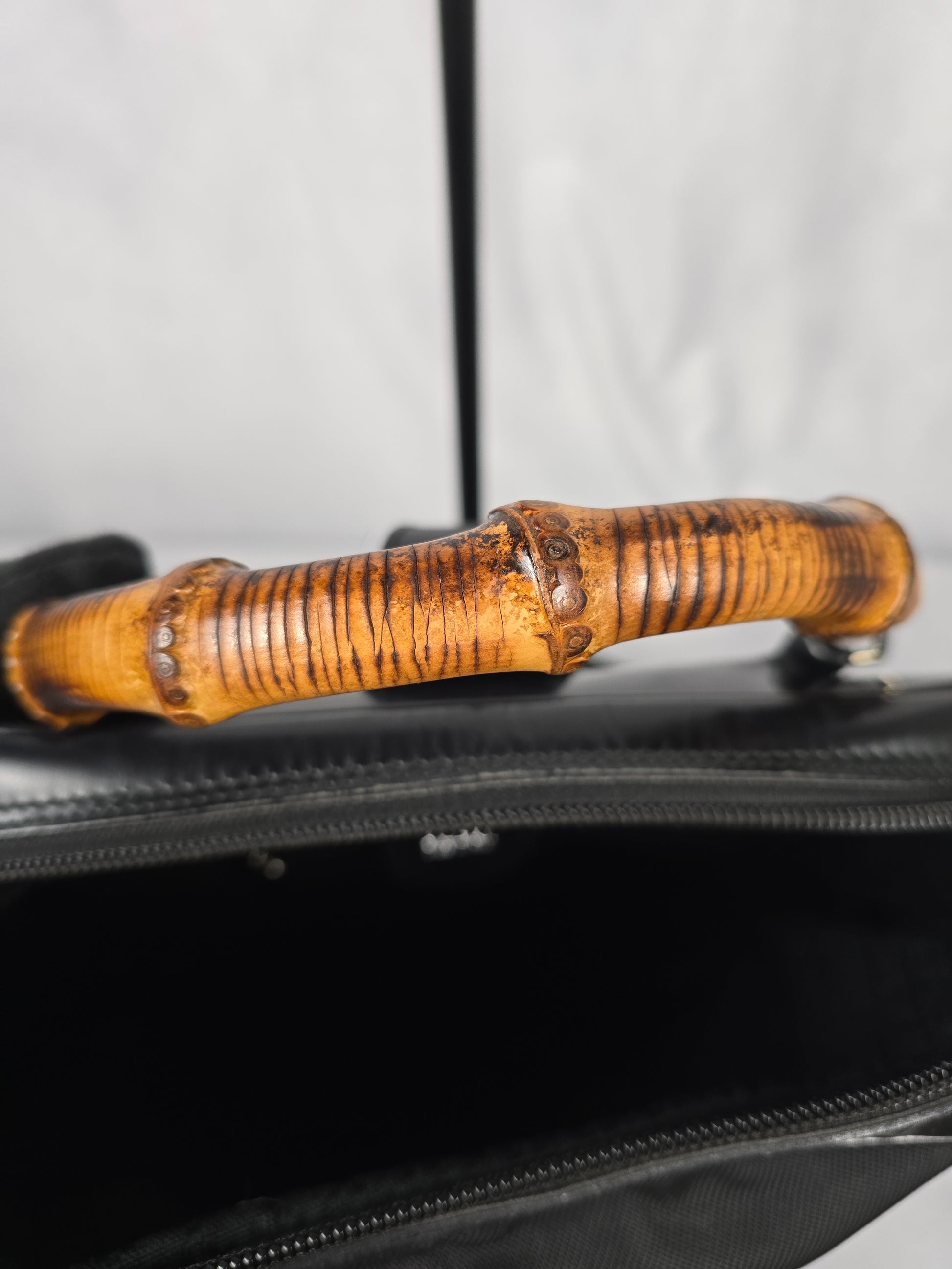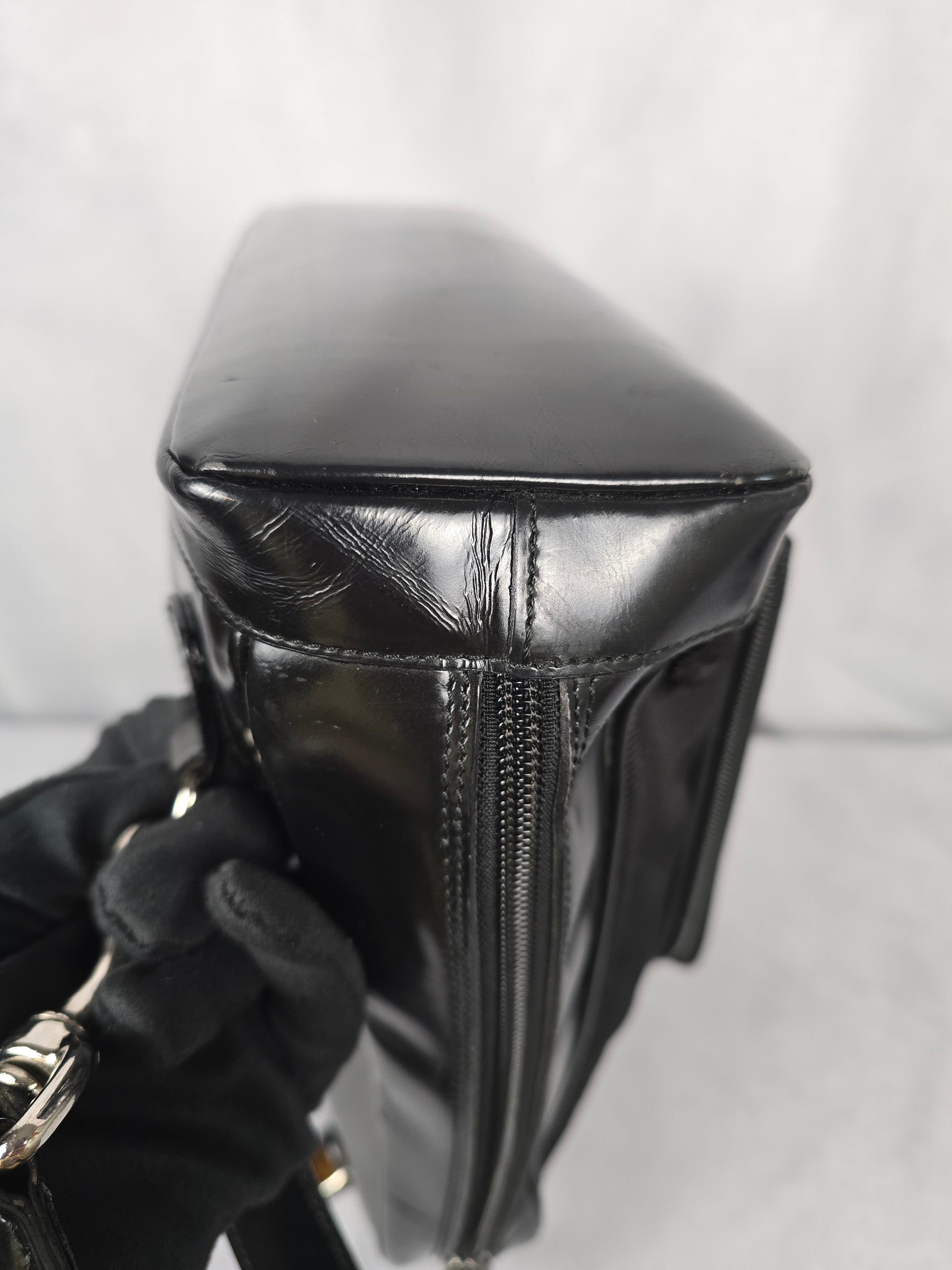 This vintage Gucci Bamboo backpack is from the 1990s, featuring a black nylon body, black patent leather trim, and the signature bamboo top handle. Sometimes referred to an a "one shoulder" of "sling" bag due to design. The bag features a main compartment with top zip closure and adjustable shoulder straps. Good pre-owned condition!