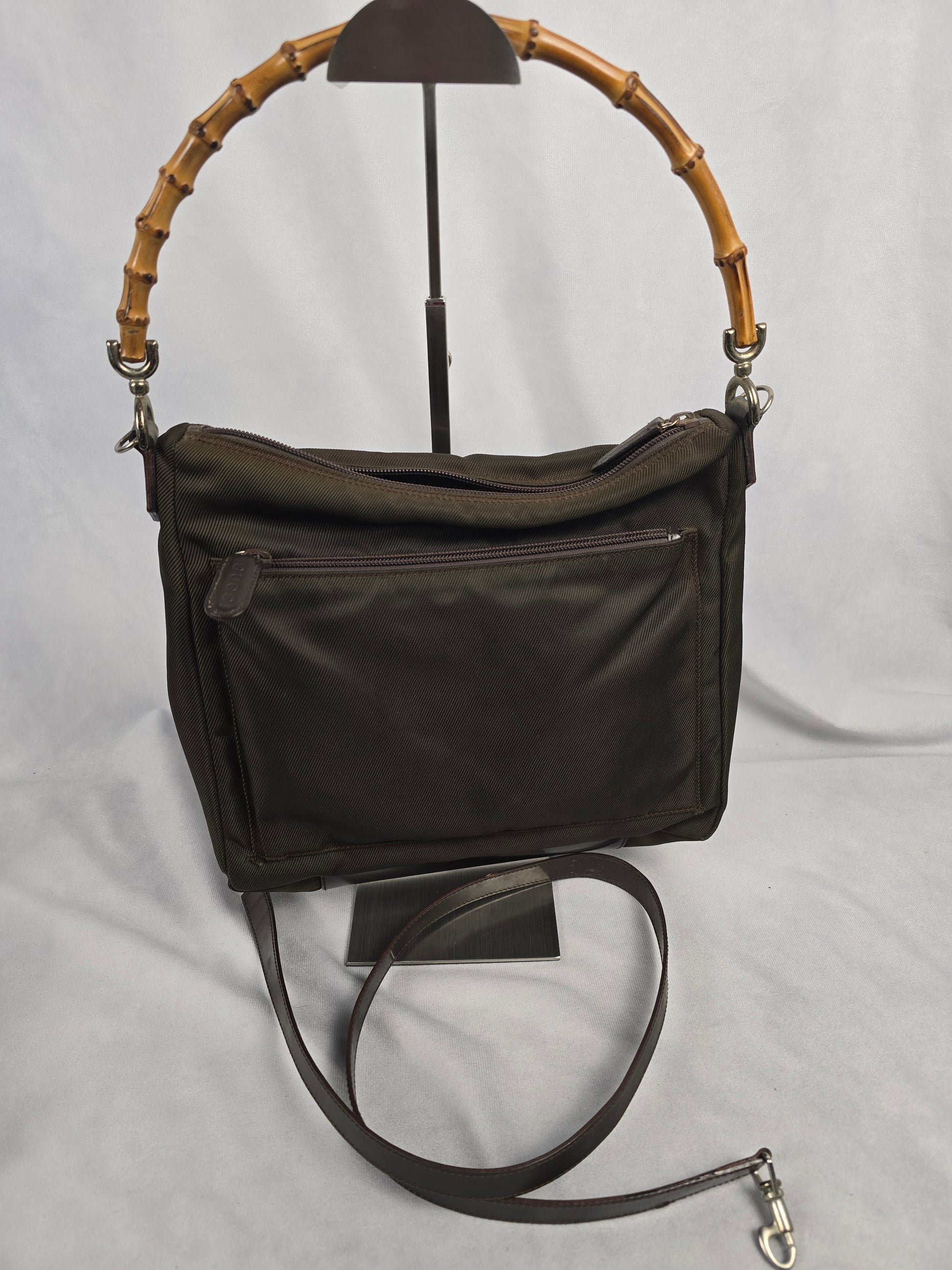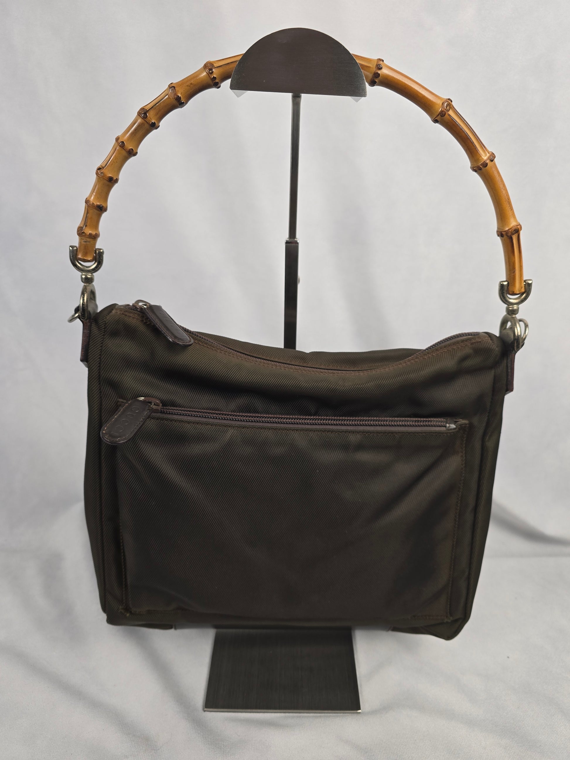 Gucci Bamboo nylon shoulder bag with bamboo top handle and optional shoulder strap in dark brown complimented by leather trim. Features the signature curved bamboo top handle, zippered pocket and top zip closure.