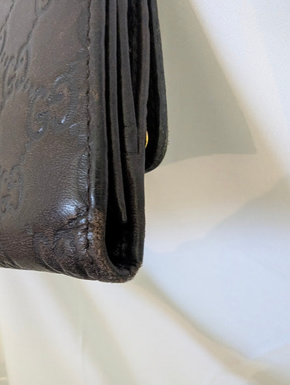 Authentic Gucci wallet crafted in dark brown GG canvas with a gold-tone metal heart accent. Features a front snap-closure flap and an additional snap-closure tab for secure storage. The interior offers excellent organization with multiple card and bill compartments. The wallet shows minor wear on the edges, tab, and interior, consistent with normal use (please see photos for details).