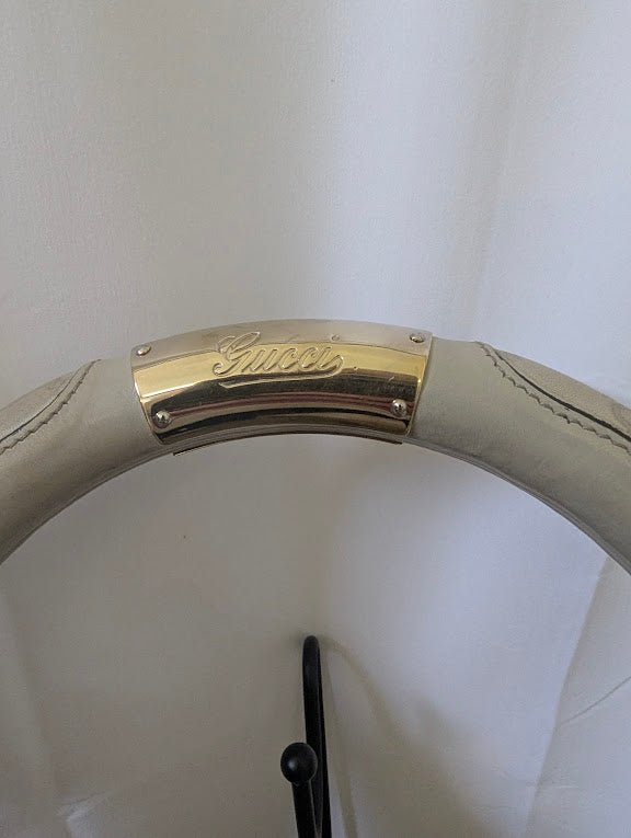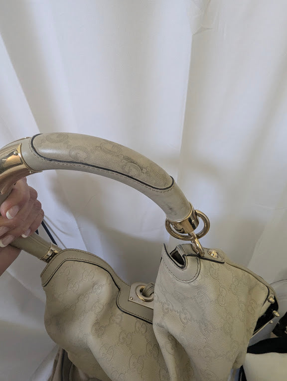 Elevate your accessory collection with the timeless elegance of this Gucci GG Indy Hobo. Crafted from luxurious ivory leather, this stunning bag is adorned with distinctive bamboo accents and stylish tassels that bring a touch of sophistication to any outfit.