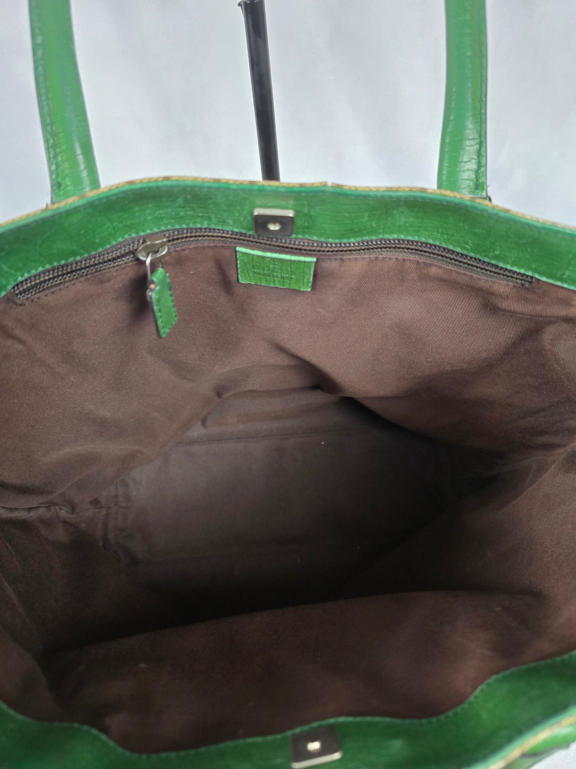 Vintage 2000's Gucci Supreme tote with rare green leather trim. Crafted from durable coated canvas and accented with a limited production green calfskin leather trim. Unique piece in good condition. Signs of use on the leather trim with a clean interior.