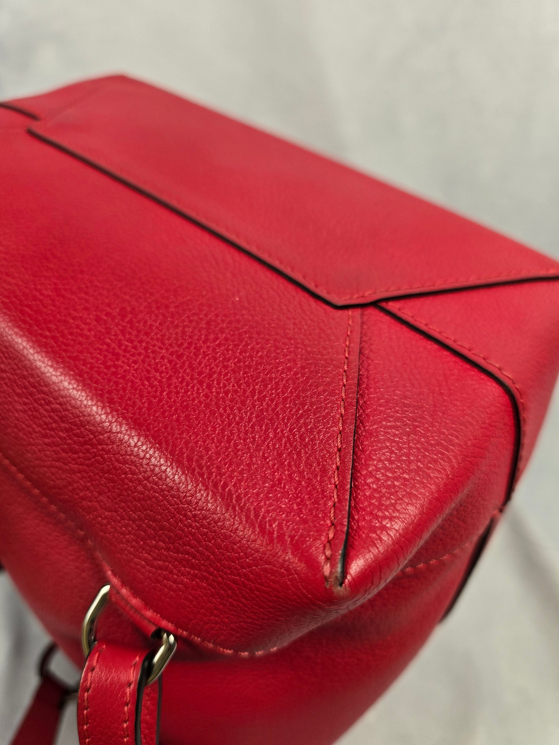 Louis Vuitton Lockme red leather backpack in very good condition. Minor scuffing on bottom corners. Silver hardware is very good condition with a few minor scuffs. Backpack straps are adjustable and in excellent condition as is the top handle. The interior is excellent.