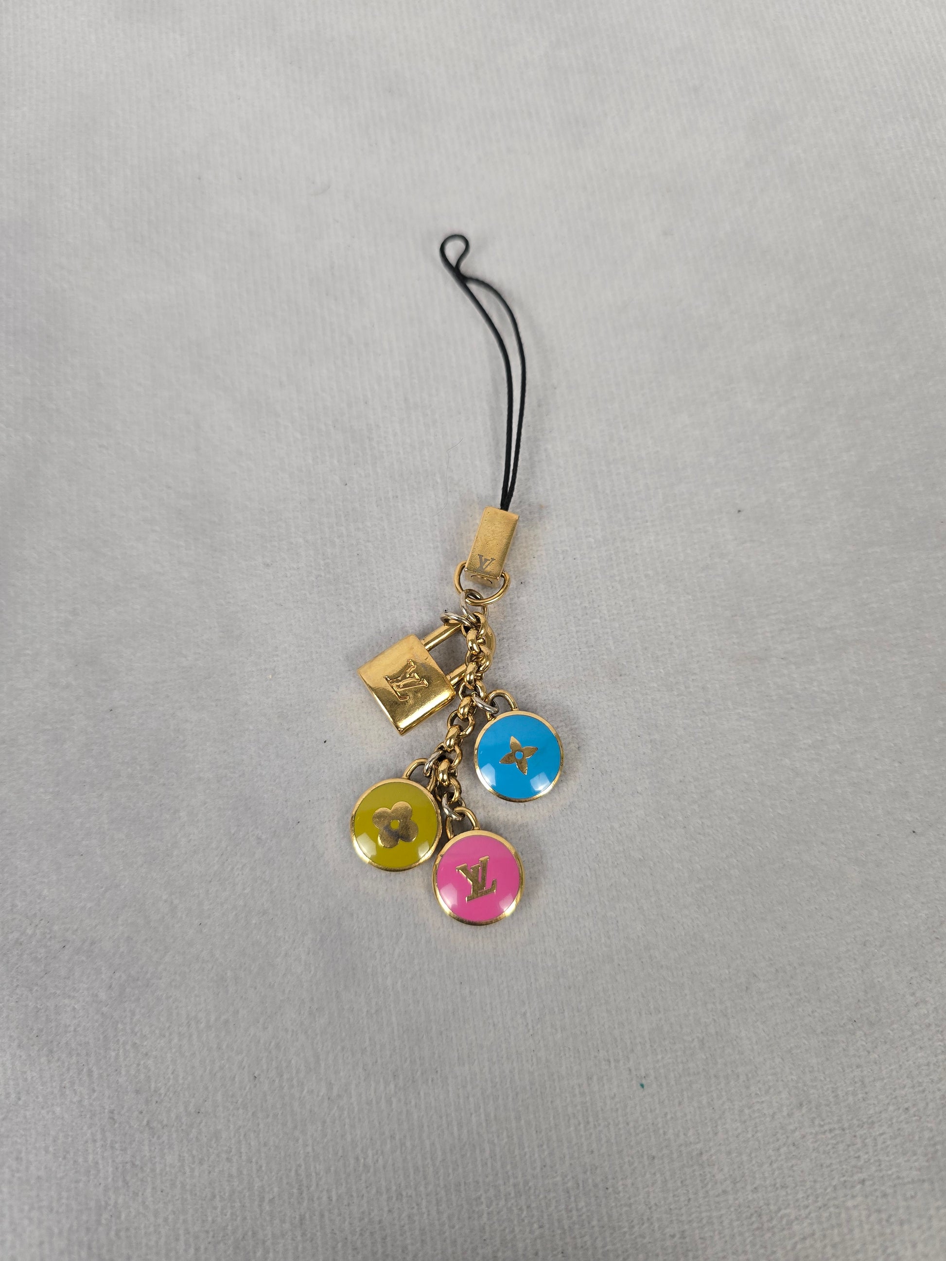 Vintage Louis Vuitton Pastilles phone or bag charm with enamel charms and a brass charm padlock. Brighten your bag or use as a phone charm. ICharms could also be used for a necklace or bracelet. Please see photos for signs of use.