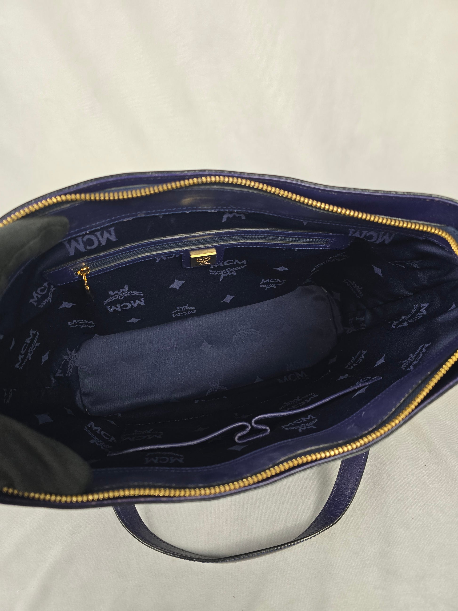 MCM Visetos tote bag featuring a cognac Visteos monogram print on the bottom and textured leather on the top. The bag has dual shoulder straps, gold-tone hardware and a zip closure. Great for travel or daily use, this large bag also has a MCM lock and key. Very good condition.