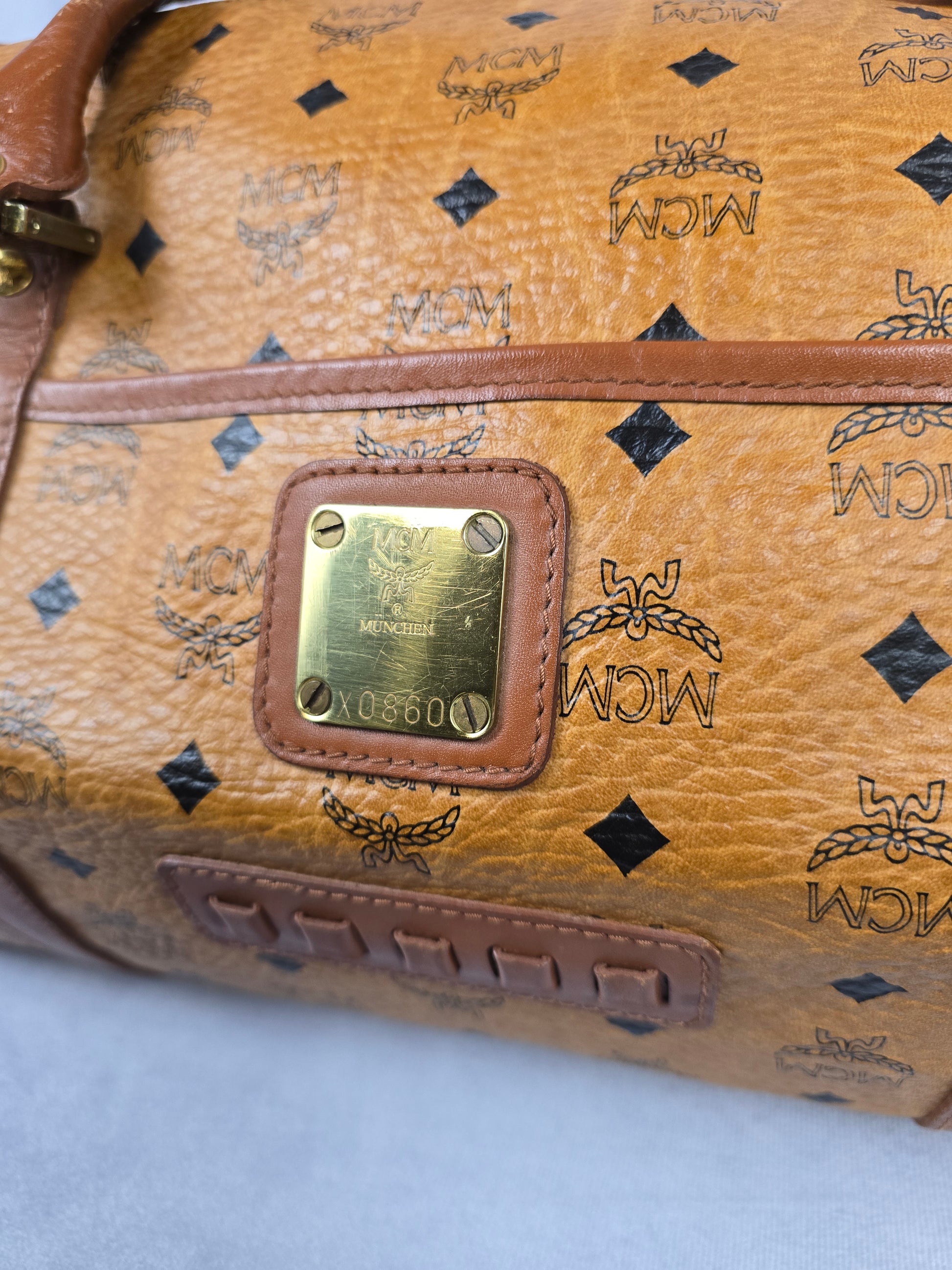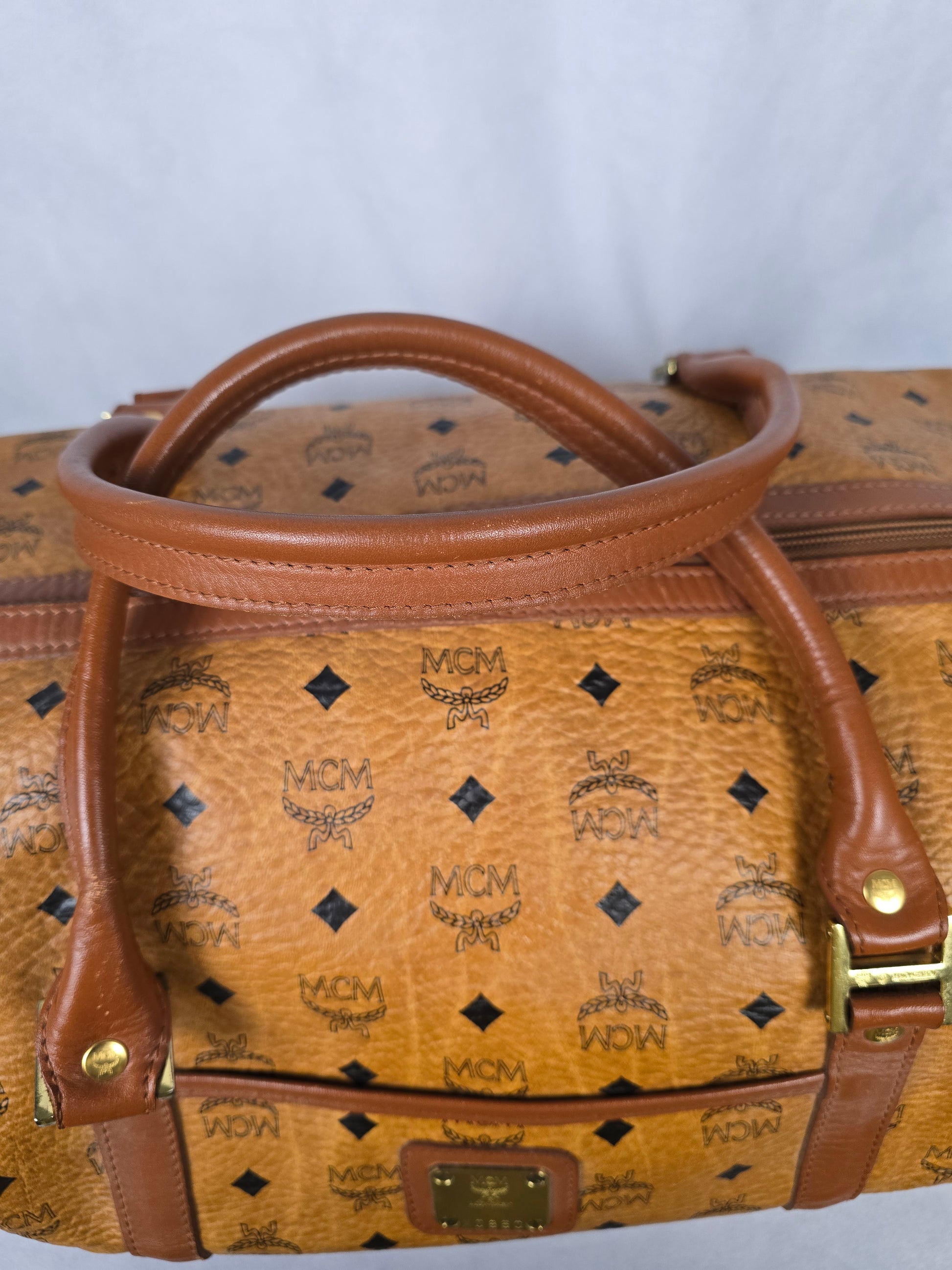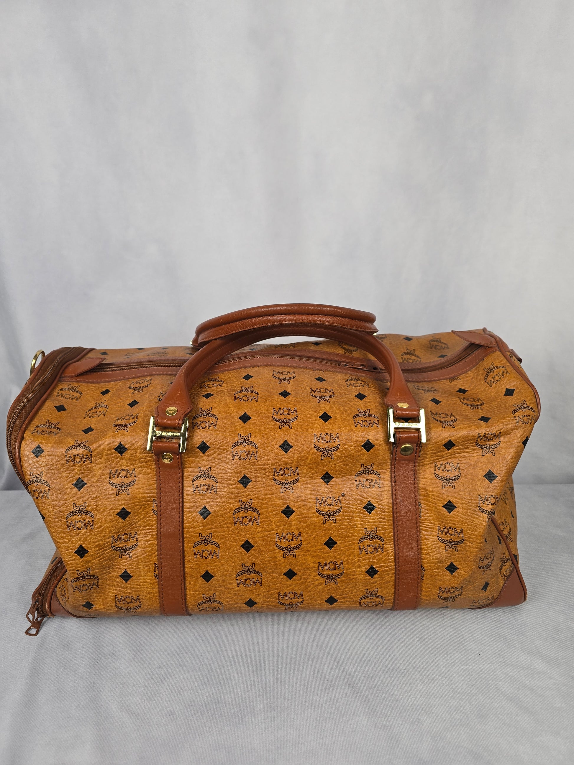 Unisex MCM Visetos duffle bag is the perfect weekender or carry on. The bag features the signature Visetos monogram pattern on coated canvas with leather trim. Roomy interior with a zipper pocket on the end for shoes Very good condition! This bag was custom made for a company as noted on the inside tag. I have never seen one with the shoe storage at the end so a bonus! Approximately 20" in length and 11" tall.