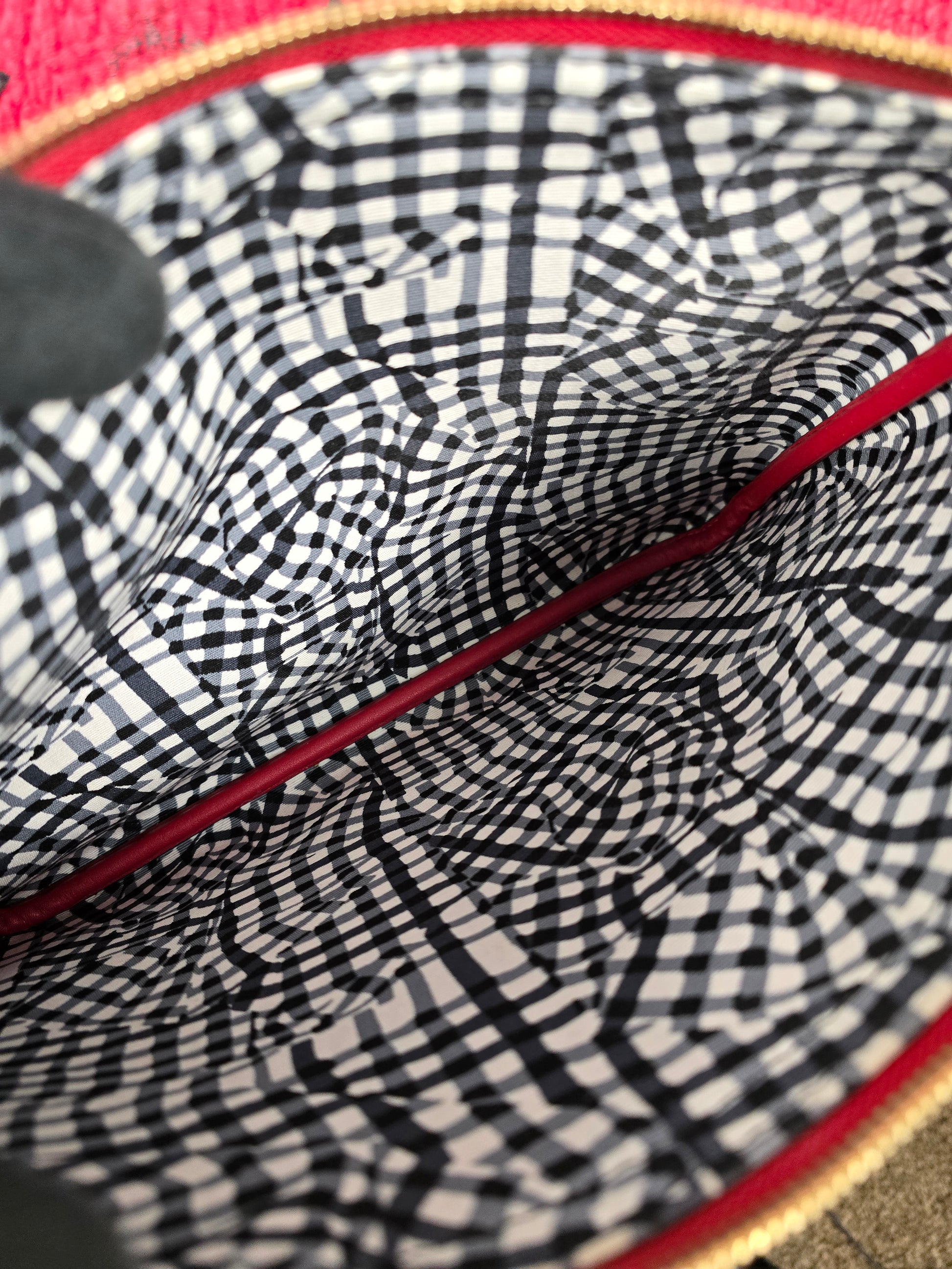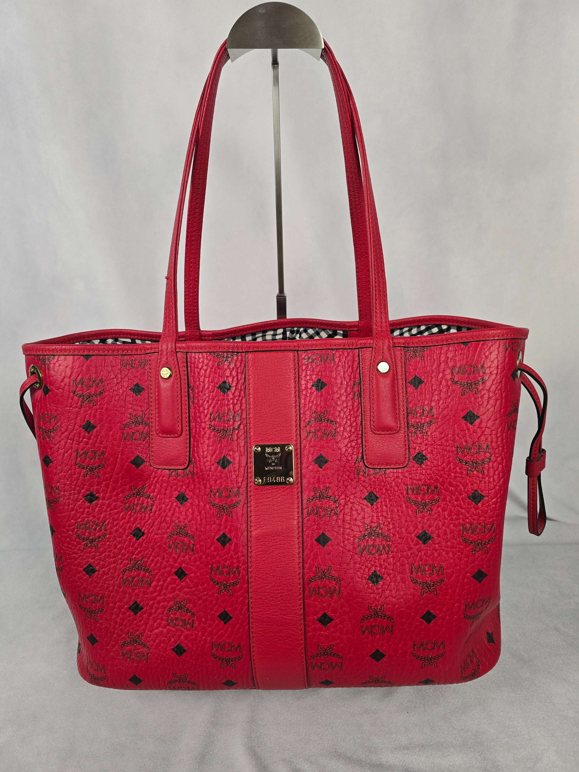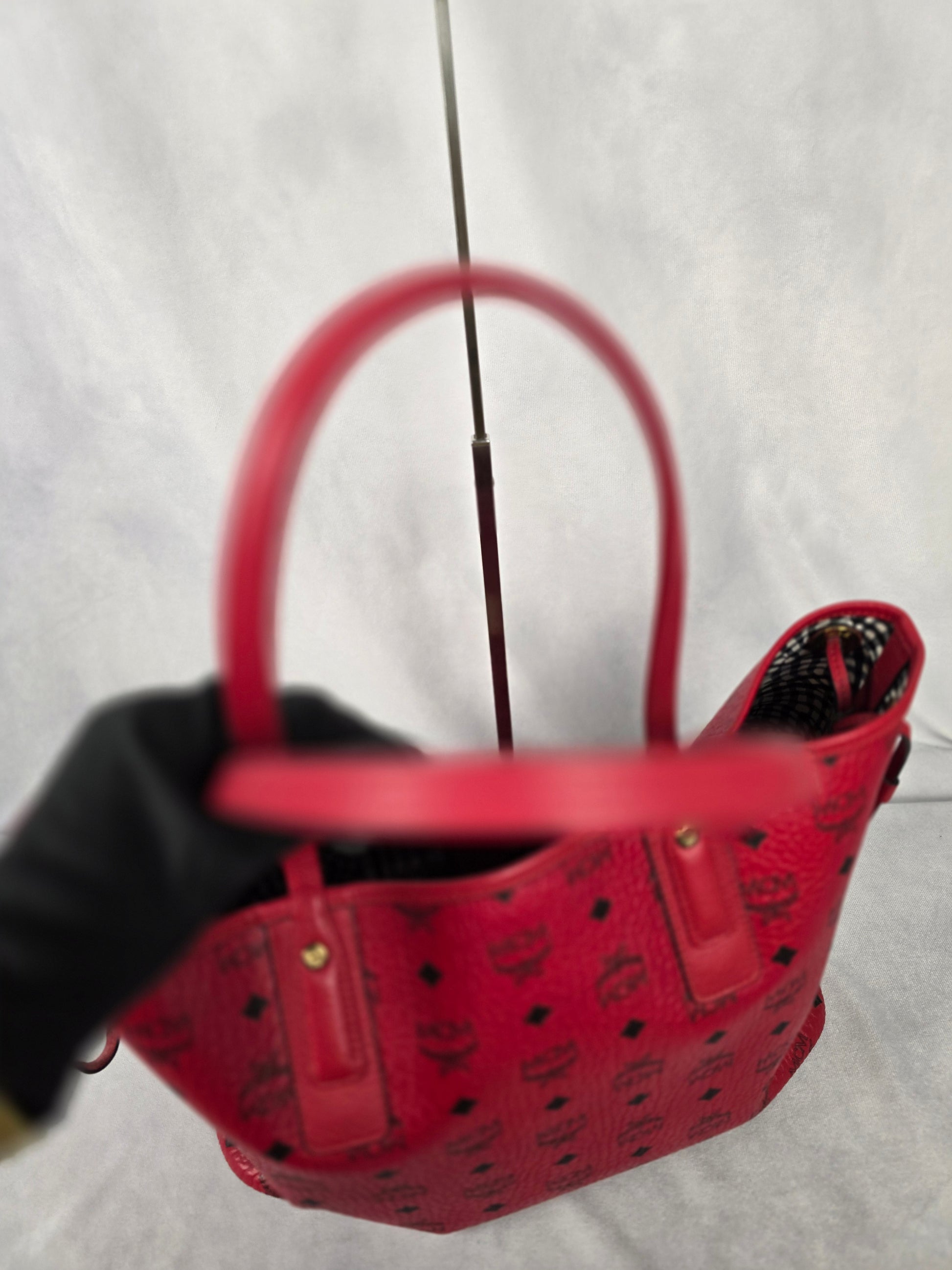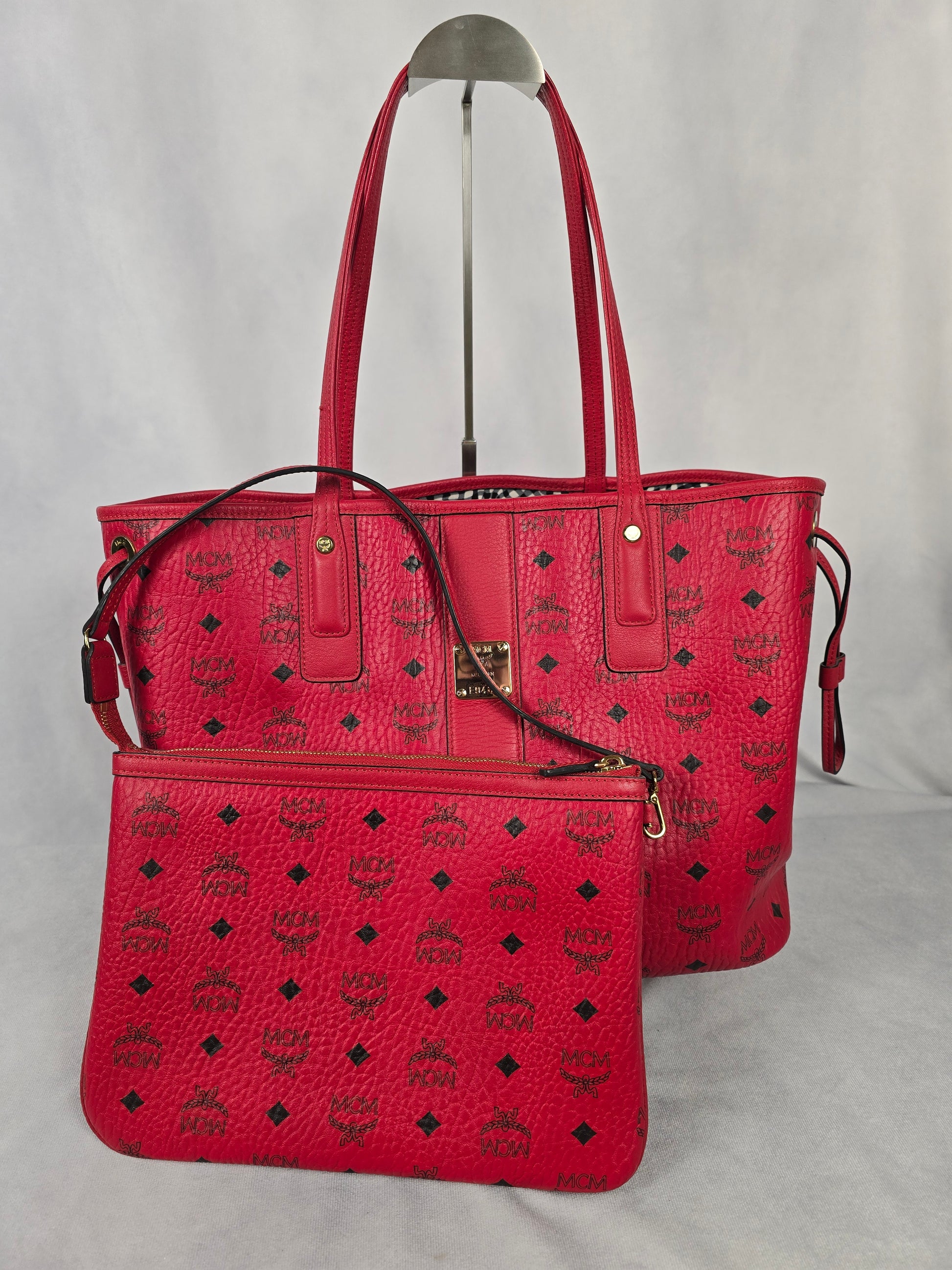 MCM red Liz reversible tote and its matching zip pouch offers two looks in one. Features the reversible design, top handles, drawstring closure on the sides and protective feet at the base. The zip pouch can be used as a standalone small bag. In very good condition.