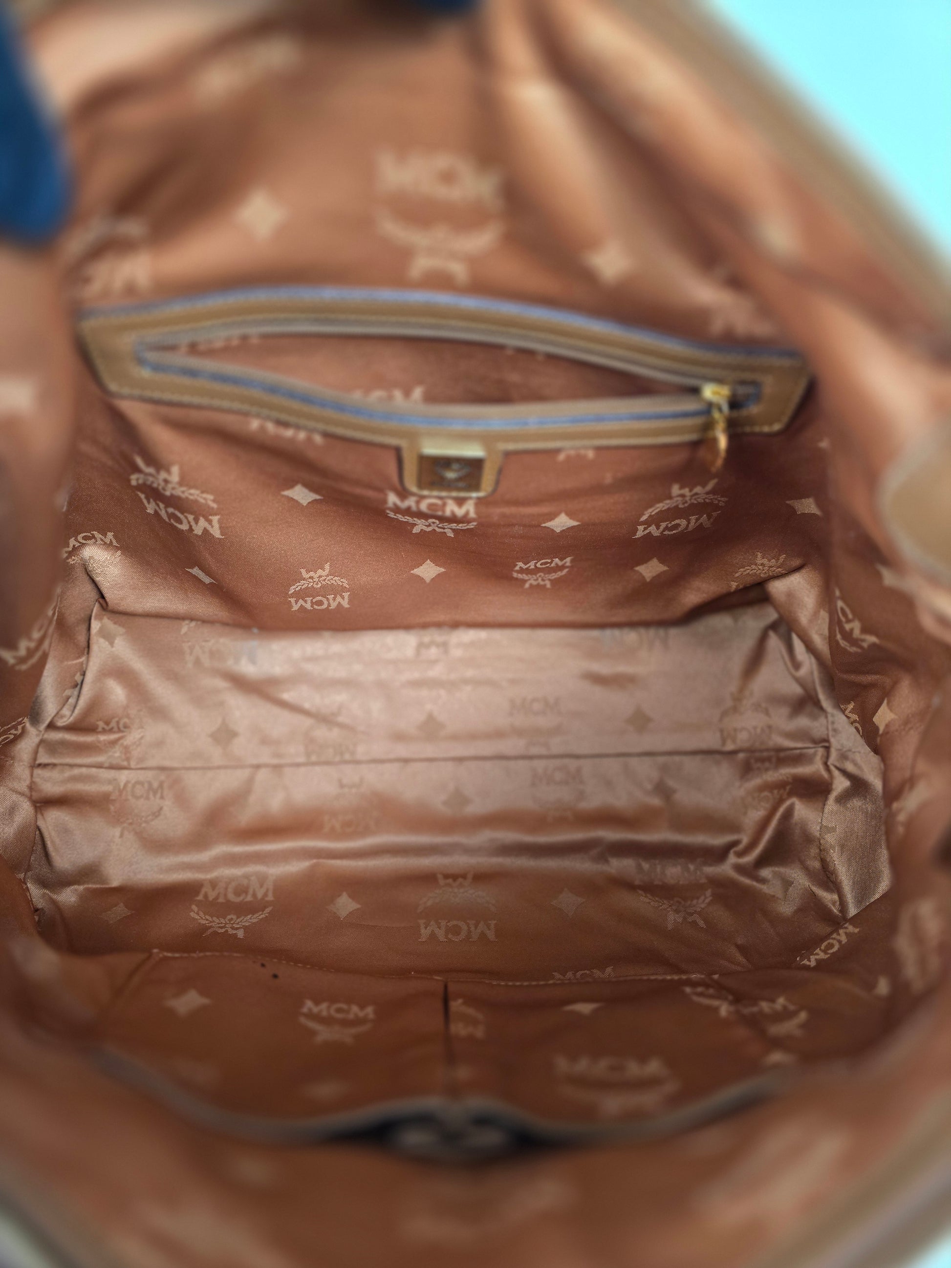 MCM Visetos tote bag featuring a cognac Visteos monogram print on the bottom and textured leather on the top. The bag has dual shoulder straps, gold-tone hardware and a zip closure. Great for travel or daily use, this large bag also has a MCM lock and key. Very good condition.