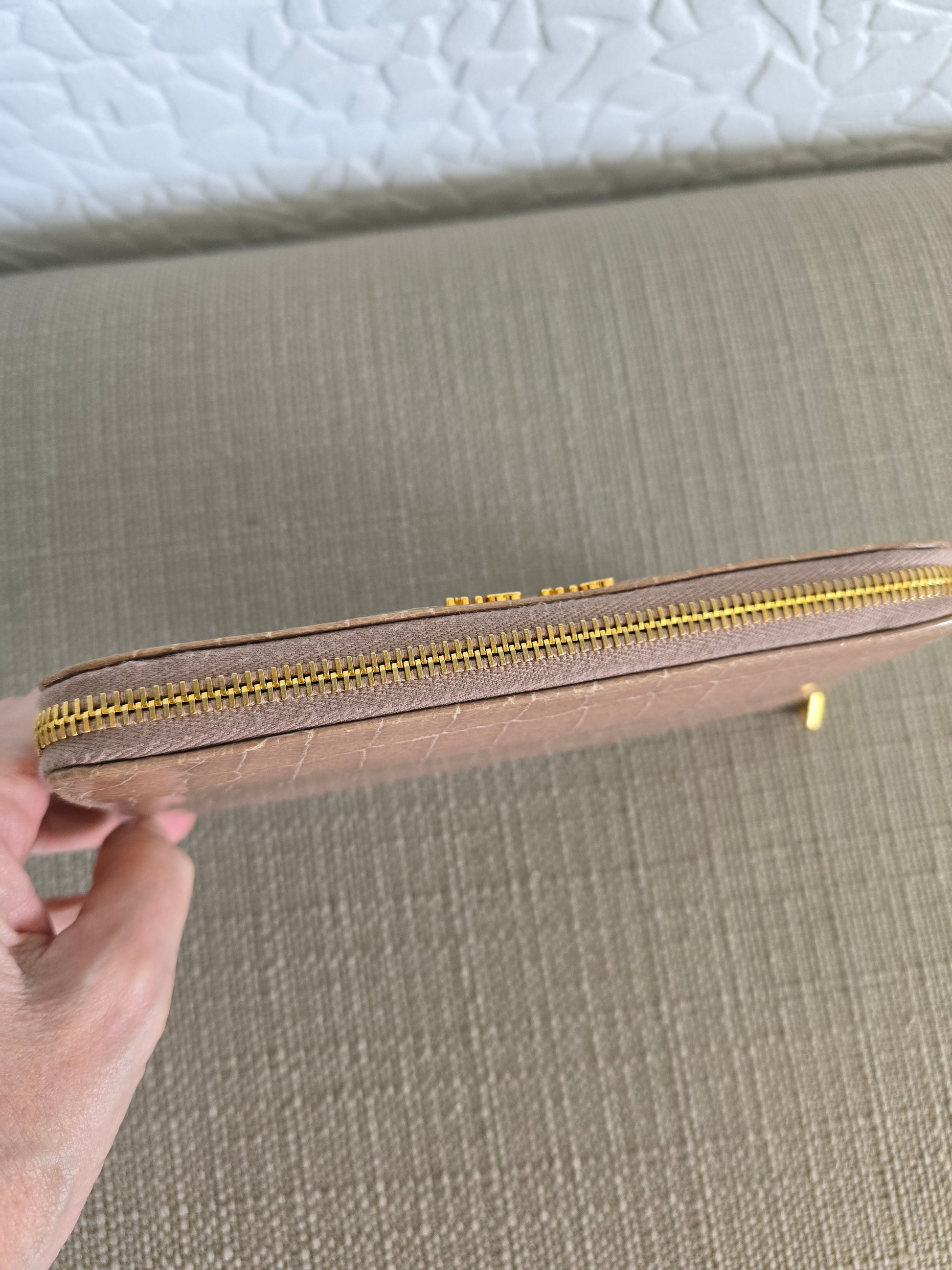 Miu Miu croc embossed tan leather zipper wallet. In good condition with minor wear/signs of use on the corners and interior. 7.5 inch size. Please see all photos!