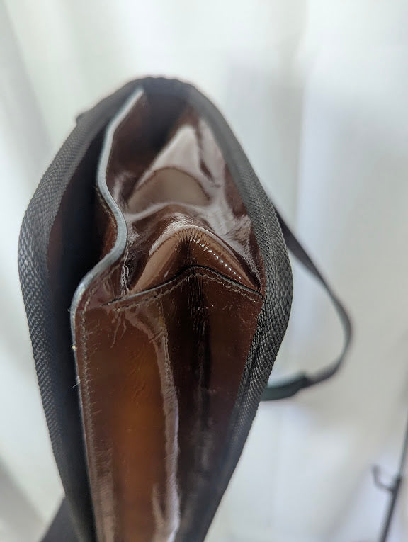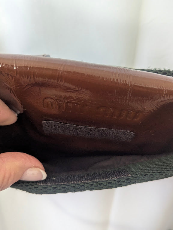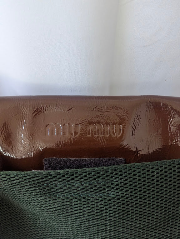 Add a bold statement piece to your collection with this rare Miu Miu Fall/Winter 1999 holographic patent leather shoulder bag. Its multi-colored brown sheen shifts beautifully in the light, creating a standout futuristic look—true to Miu Miu’s iconic late-’90s aesthetic.