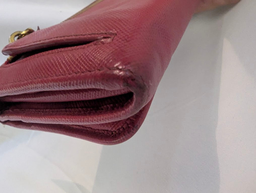 Add a pop of color to your everyday with this authentic Prada wallet in bright pink leather with signature bow detail. Features 10 card slots, 3 bill slots, an extra storage slot, and interior & exterior zipper compartments. Shows gentle signs of wear on edges, corners, and some wrinkling, but fully functional and stylish. Comes with Prada box (note: one corner of lid is split). Perfect compact designer accessory for everyday use or gifting!