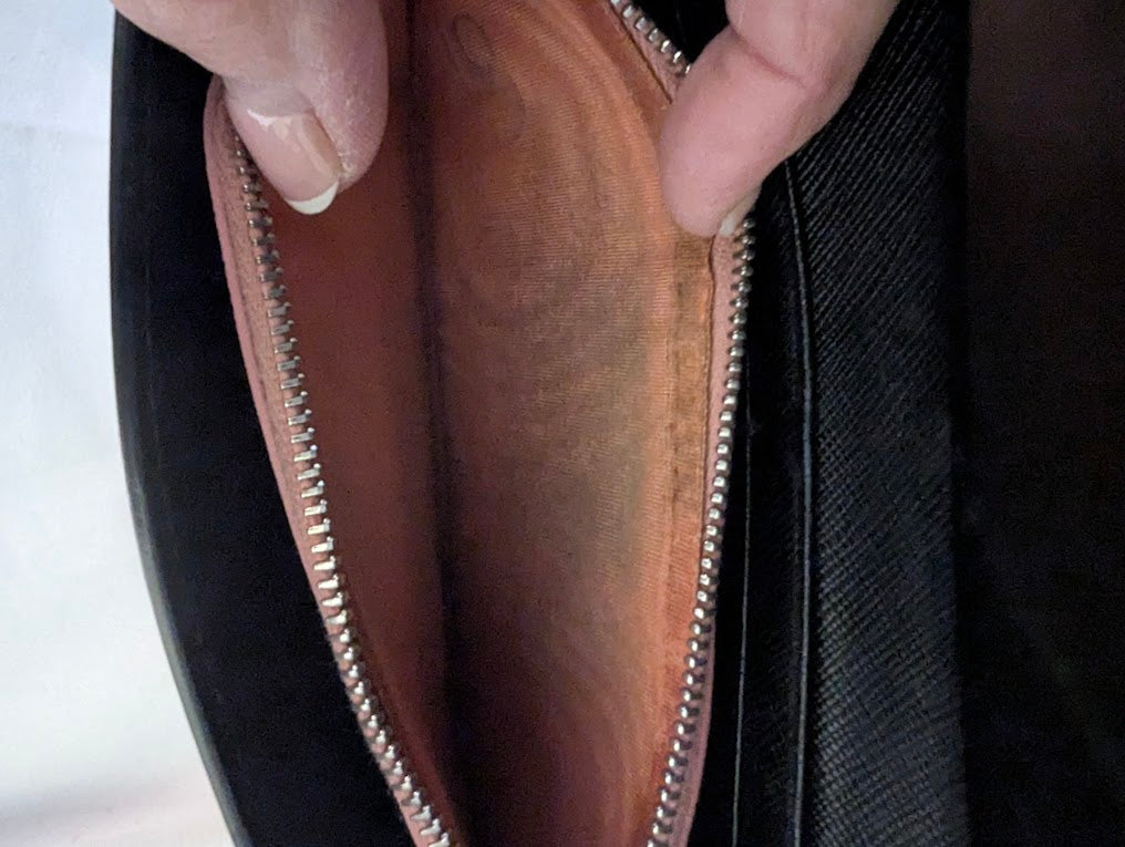 Note: Coin pouch shows wear and residue.