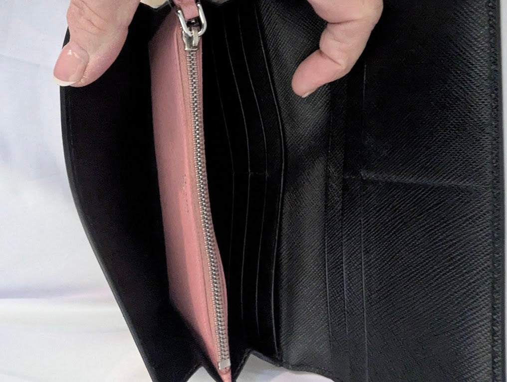 Authentic Prada Robot wallet featuring the iconic robot motif with a playful yet sleek design. The interior is finished in black with a contrasting pink zipper coin pouch, offering both style and functionality. The wallet is in very good condition overall, with wear and residue visible inside the coin pouch consistent with normal use (please see photos for details). Includes original packaging and authentication.