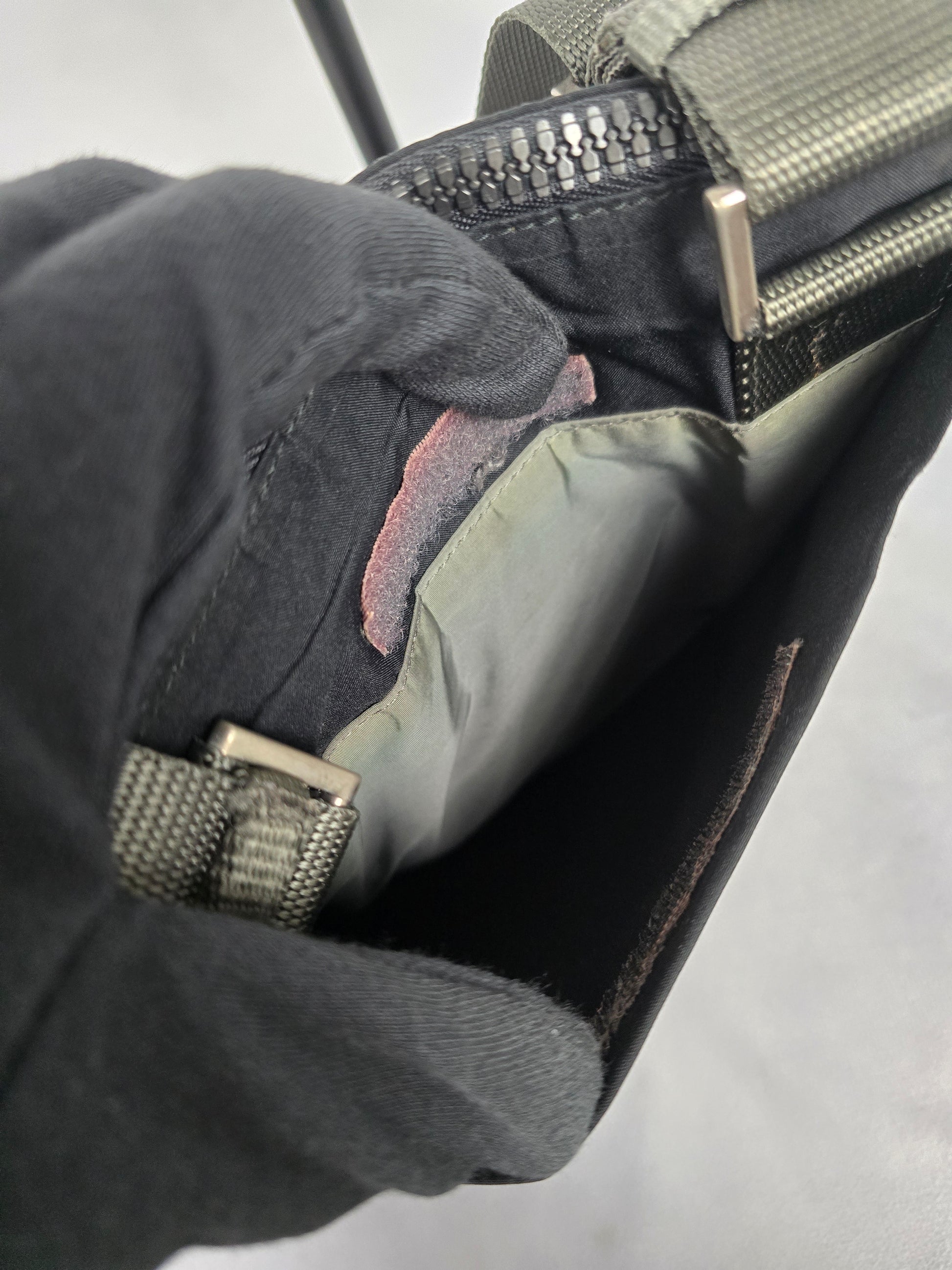 Sporty Prada black nylon crossbody bag with adjustable gray strap. Very good pre-owned condition. Associated with the Prada Linea Rossa line, known for its distinctive red label.