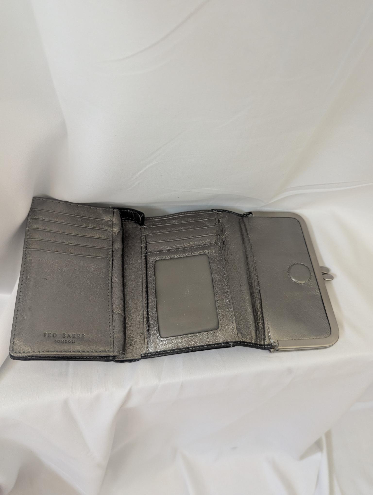 Crafted from ultra-soft black leather with a sleek silver-toned interior, this Ted Baker wallet is both stylish and functional. Compact in size yet thoughtfully designed, it offers multiple compartments for easy organization.