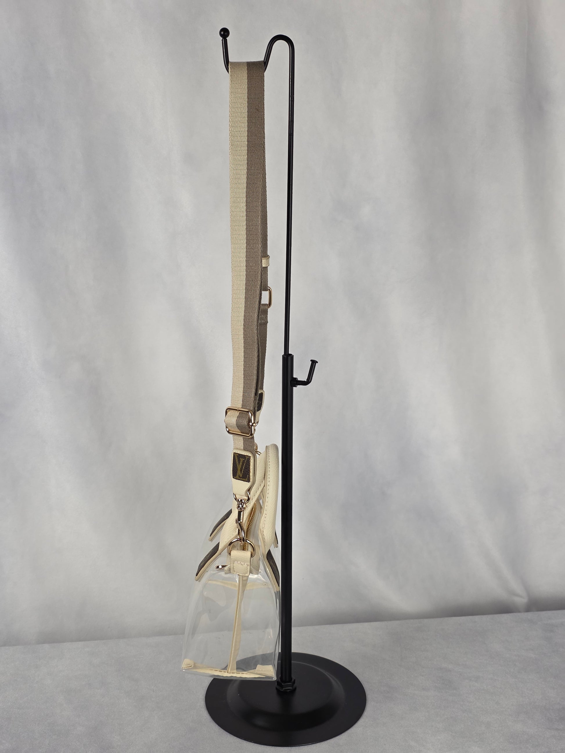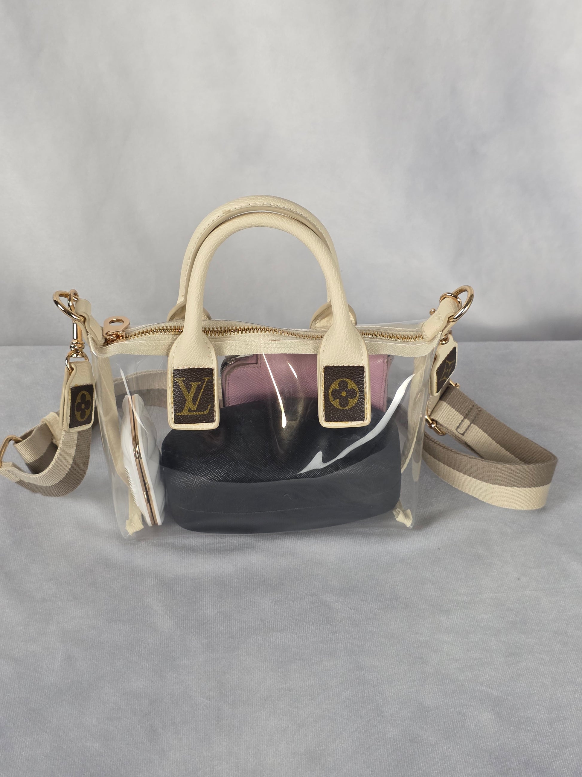 UPCYCLED STADIUM BAG WITH LUXURY ACCENTS, CREAM/CLEAR