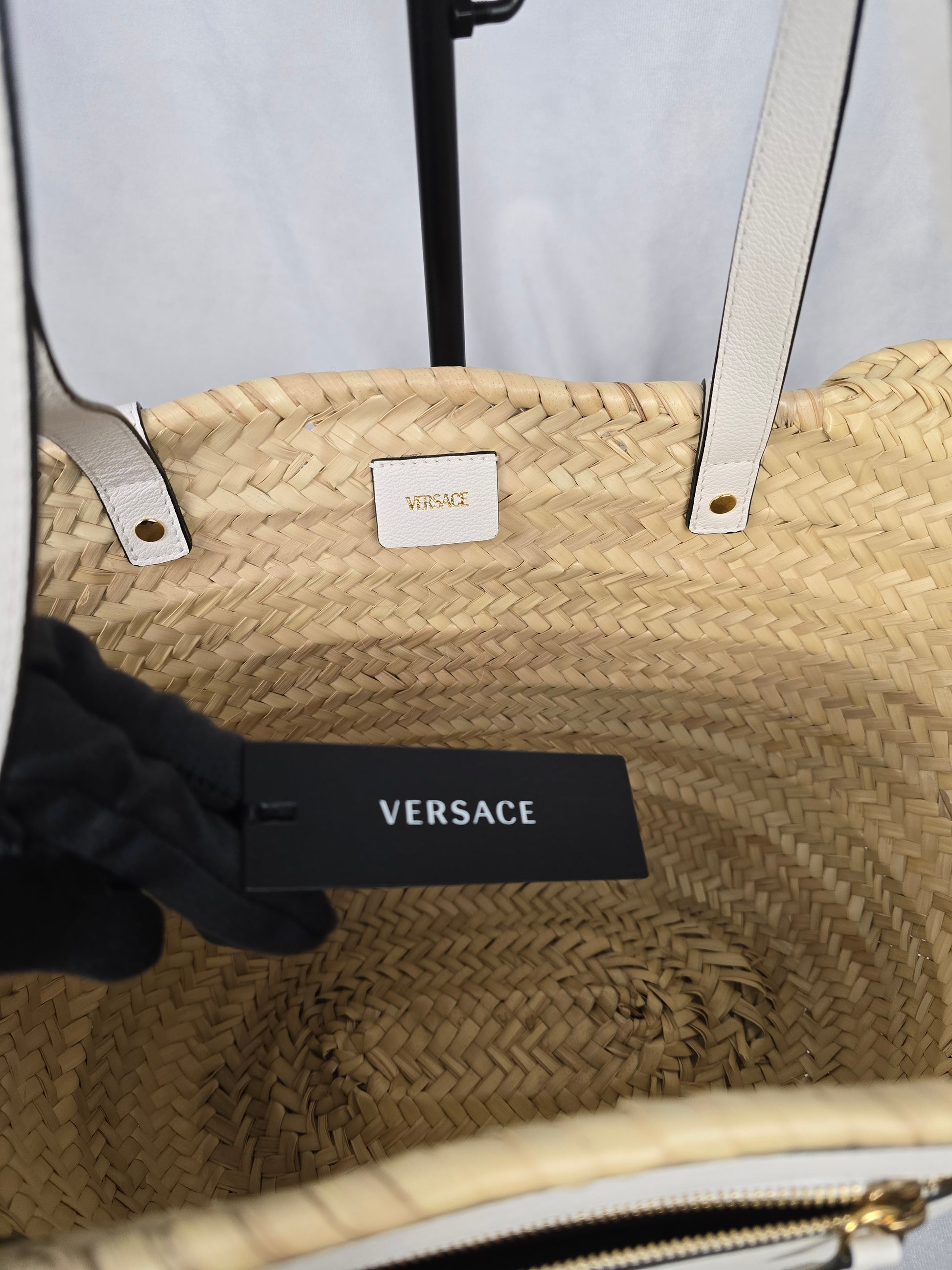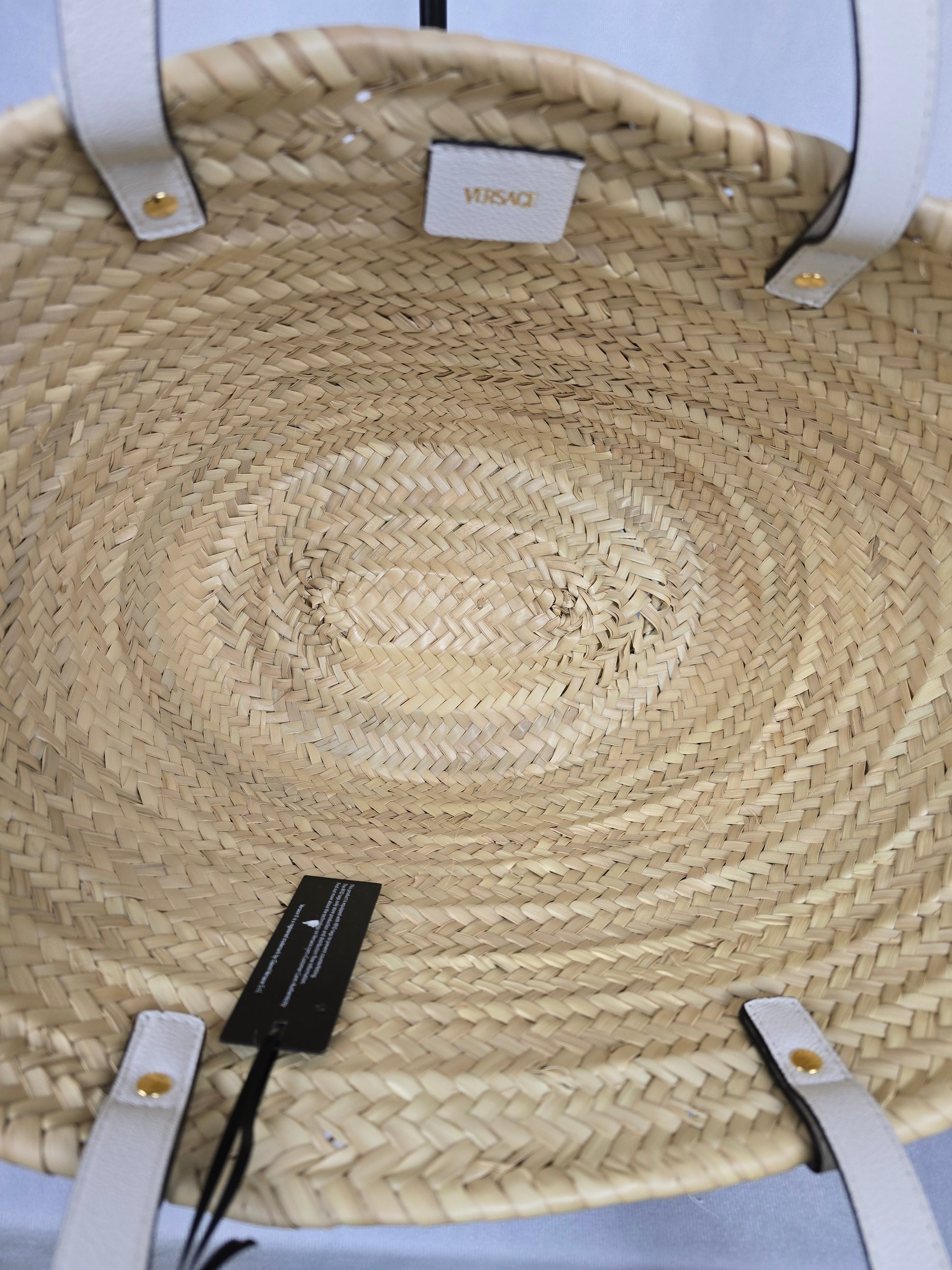 Versace Medusa Palazzo Logo Raffia Woven Straw and White Leather Tote-NEW
