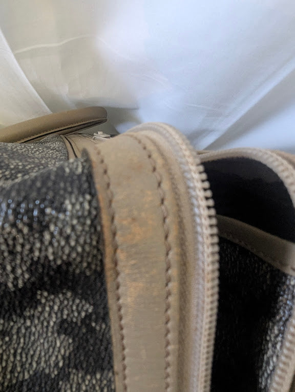 Authentic vintage Yves Saint Laurent large travel bag, perfect for weekend getaways or carry-on use. Features a classic structured silhouette with generous interior space. The exterior shows minor corner wear and light discoloration spots on the handles, consistent with age and use (please see photos for details). Includes original luggage tag holder and lock (no key). A timeless YSL travel piece with enduring style.