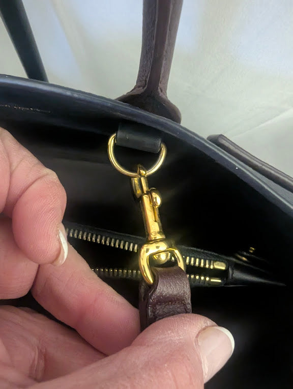 - Gold Hardware: Very Good+ — one small tarnish spot on the zipper pull of the removable pouch; gold lock in holder shows slight tarnishing